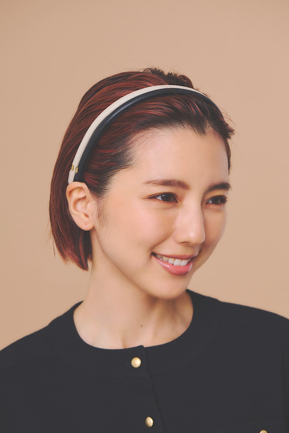 「カチューシャ、ちょうど最近狙っていたんです!付けるだけでおしゃれに見えるから便利ですし、ベーシックカラーなら今の赤めの髪色ともマッチすることが分かって嬉しかったです。2本付けのアレンジは、そんな見せ方もあるんだ!と驚きました」(真野さん)