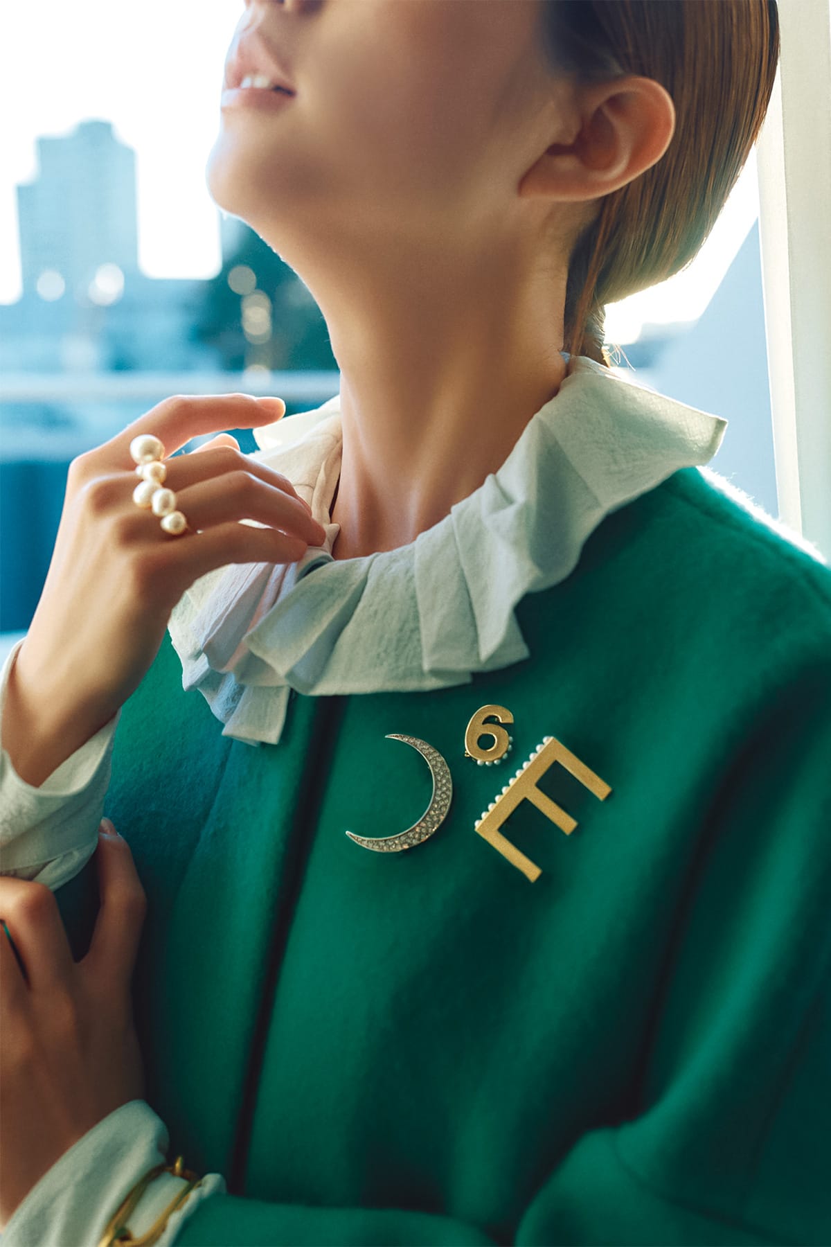 ネックレスやリング同様、自分の好きなモチーフを持っているとスタイリングがもっと楽しくなるはず。地厚なコートに着けてこそ、そのボリュームが引き立ちます。ブローチ6¥9,680、E¥10,780 リング¥21,780(すべてステラハリウッド)月ブローチ¥16,500(アデル ビジュー)ブラウス¥35,200(デザインワークス/デザインワークス 銀座店)コート¥110,000(ツル バイ マリコ オイカワ)