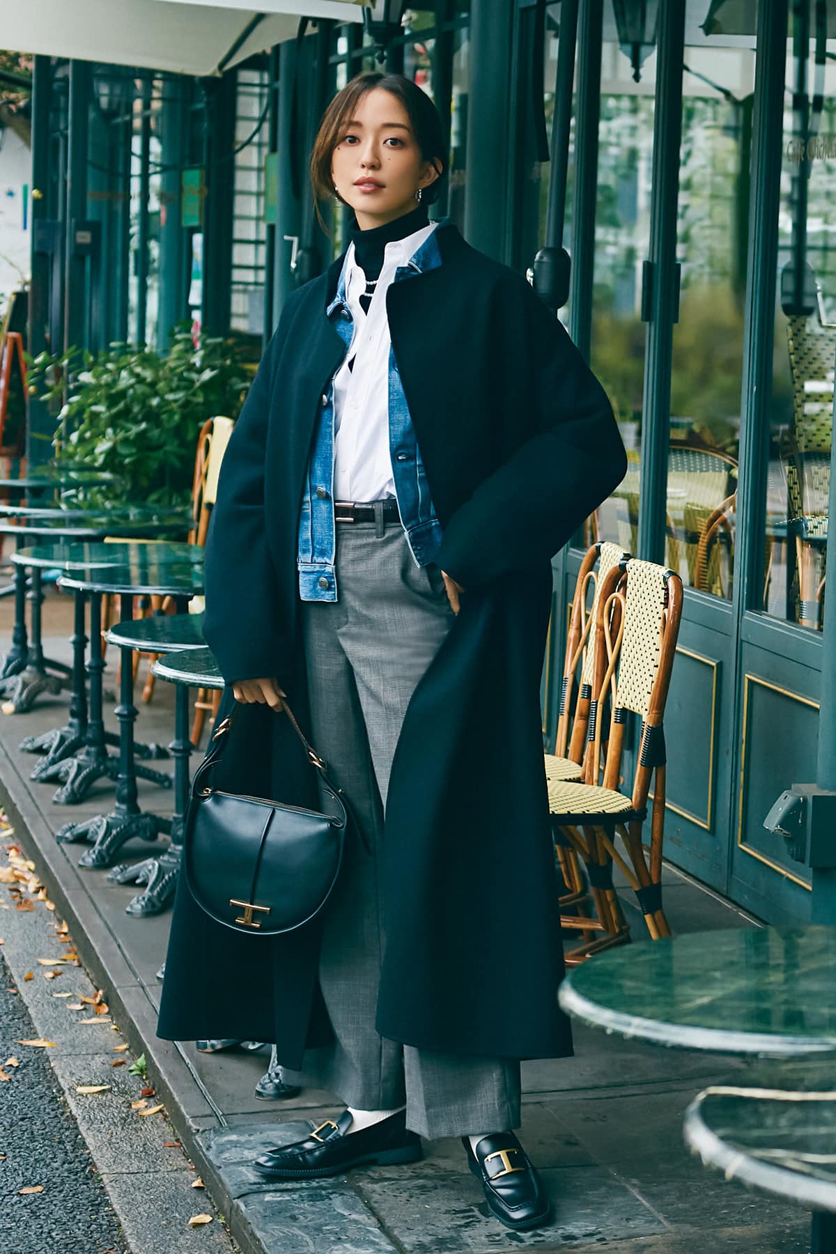 「黒と相性のいいGジャンのブルーと白シャツ、さらに黒タートルをインすることでぐっと旬の雰囲気に。アクセサリーはデニムに似合うパールがおすすめ。ボトムスインや旬のベルトでさらに今年らしく」(大野さん)コート¥79,200シャツ¥31,900(ともにカオス/カオス丸の内)Gジャン¥42,900(ハイク/ボウルズ)ニット¥27,500(スローン)パンツ¥35,200(アパルトモン/アパルトモン 青山店)ベルト¥12,400(バナナ・リパブリック)バッグ¥277,200シューズ¥100,100(ともにトッズ/トッズ・ジャパン)ピアス¥7,920(ファシアータ/フォーティーン ショールーム)ネックレス¥14,040(アビステ)靴下/スタイリスト私物