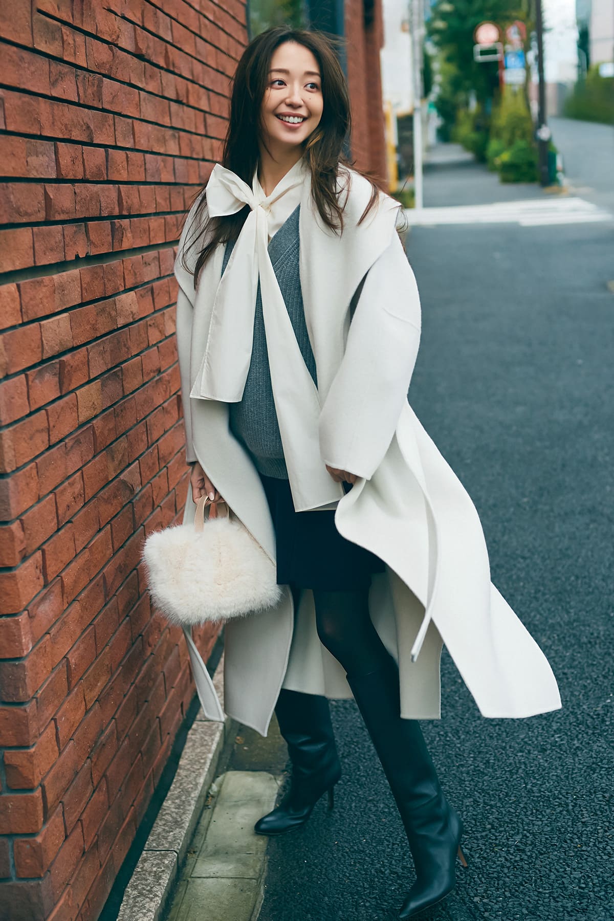 「人気継続中のボウタイブラウス。インパクトが強く甘く見えがちなので、モノトーンのグラデーションでまとめた着こなしが正解です。グレーのニットベストを挟むことで、コート~ブラウス~ボトムスのつなぎ役になり全体をなじませる効果もあります」(大野さん)コート¥47,300(FRAY I.D/FRAY I.D ルミネ新宿2店)ベスト¥31,900(アパルトモン/アパルトモン 青山店)ブラウス¥25,300(アルアバイル)ショートパンツ¥31,900〈カバナ〉ブーツ¥97,900〈ペリーコ〉(ともにアマン)バッグ¥28,600(ANAYI)タイツ※スタイリスト私物