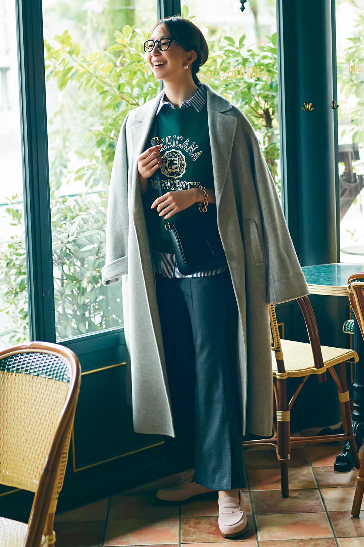 「ロゴスウェットそのものが主張あるデザインなので、合わせるインナーや小物まで方向性を統一するのがオシャレに見せるコツ。ブルーのストライプシャツを挟めば、きちんと感も今っぽさも手に入ります」(大野さん)コート¥53,900(アルページュストーリー/アルページュストーリー プレスルーム)スウェット¥24,200(アメリカーナ/アパルトモン 青山店)シャツ¥30,800(マックス アンド コー/マックスマーラ ジャパン)パンツ¥24,200(プラージュ/プラージュ 代官山店)バッグ¥187,000(J&M デヴィッドソン/J&M デヴィッドソン 青山店)シューズ¥137,500(ジェイエムウエストン/ジェイエムウエストン 青山店)メガネ¥36,300(アイヴァン/アイヴァン 東京ギャラリー)ピアス¥7,560(アビステ)ブレスレット¥9,350(インムード/フォーティーン ショールーム)