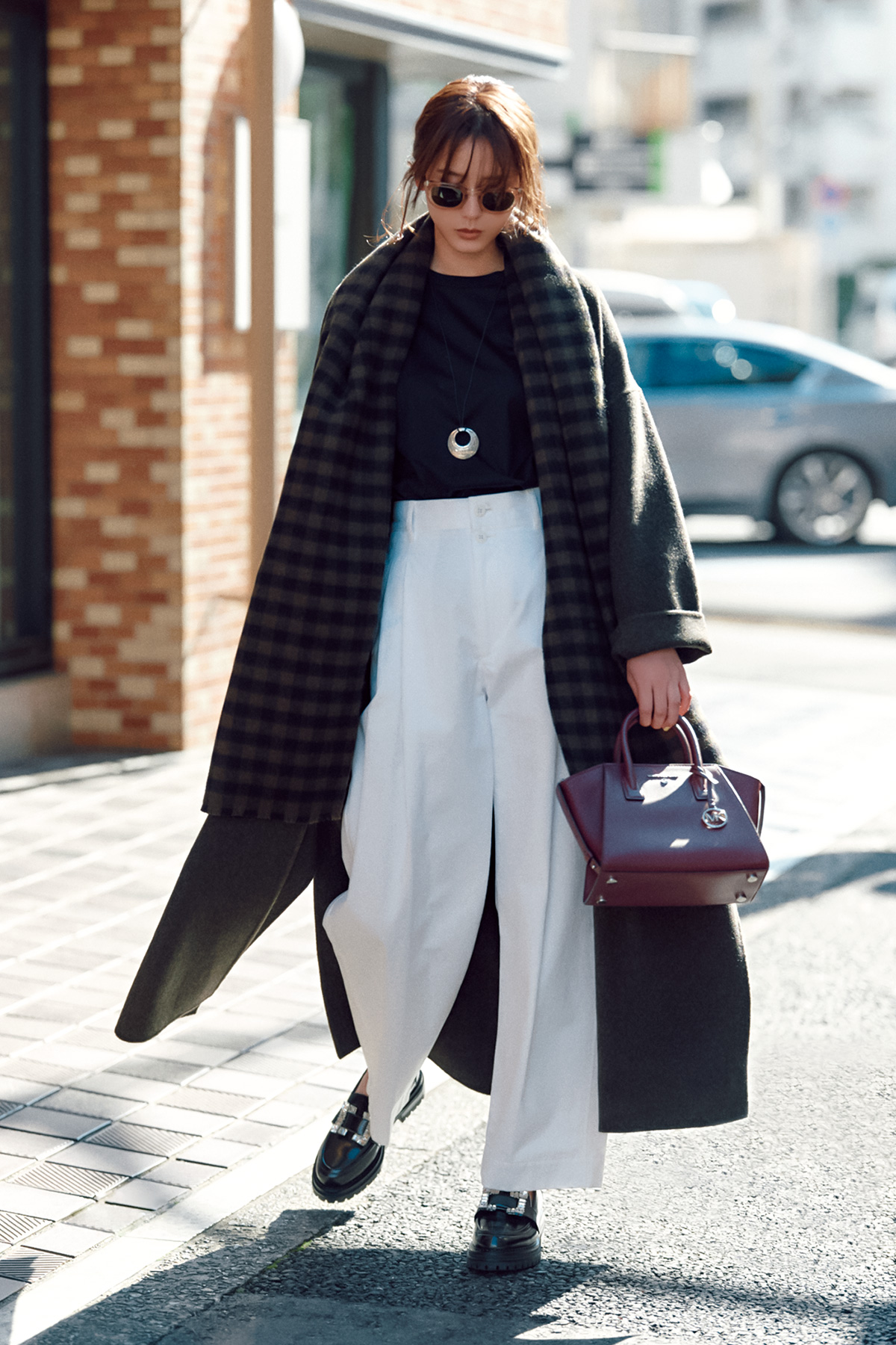 前回と同じパンツを今度はキレイめに。他がダークカラーでも映える。パンツ¥36,300(ロエフ/ユナイテッドアローズ原宿本店)コート¥137,500(サクラ/インターリブ)カットソー¥11,550(スローン)バッグ¥50,600(マイケル マイケル・コース/マイケル・コース カスタマーサービス)シューズ¥174,900(セルジオ ロッシ/セルジオ ロッシ カスタマーサービス)ストール¥18,000(バナナ・リパブリック)サングラス¥46,200(モスコット/モスコット トウキョウ)ネックレス¥25,300(アダワットトゥアレグ)