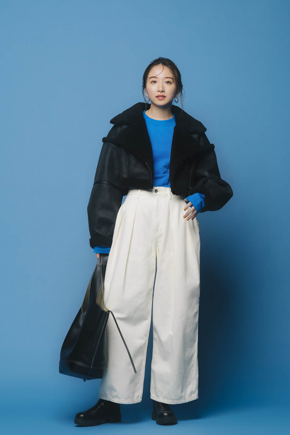 ブルゾン¥20,900カットソー¥7,997パンツ¥14,993(すべてTHROW by SLY/バロックジャパンリミテッド)バッグ¥58,300(VASIC/ヴァジックジャパン)ブーツ¥23,100(ダイアナ/ダイアナ 銀座本店)ピアス¥13,530(パズ コレクティブ/ZUTTOHOLIC)