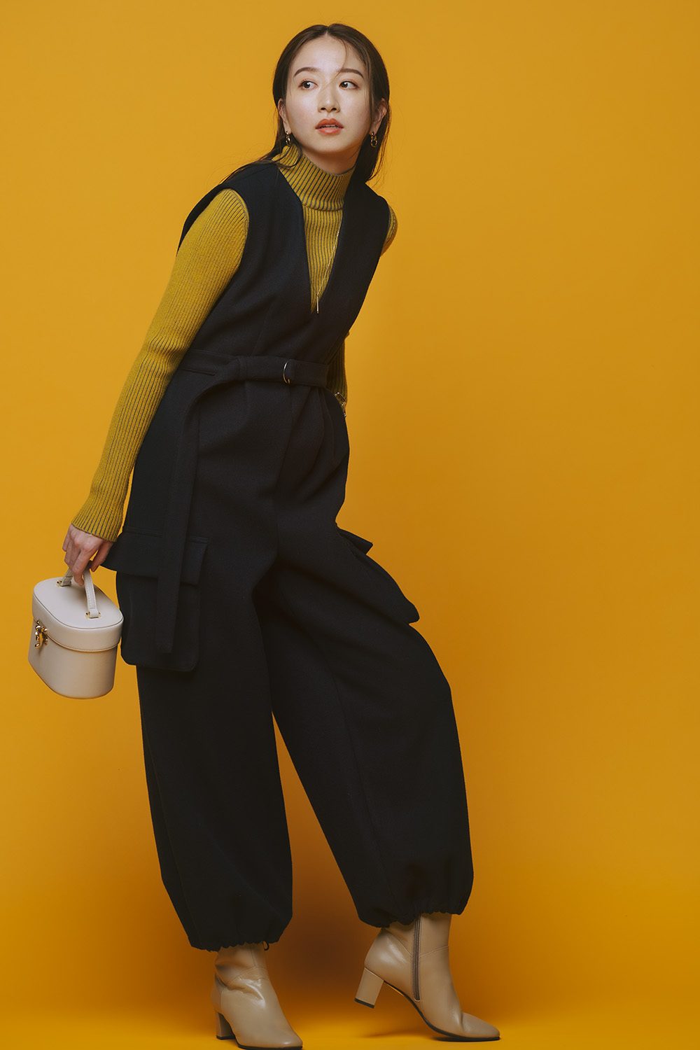 オールインワン¥15,400ニット[ネックウォーマーとセット]¥11,000(ともにPLUS/アズール バイ マウジー/バロックジャパンリミテッド)バッグ¥11,000(ツル バイ マリコ オイカワ)ブーツ¥30,800(ワシントン/銀座ワシントン銀座本店)ピアス¥16,500〈ココシュニック オンキッチュ〉ネックレス¥41,800(ともにココシュニック)ブレスレット¥11,000(イン ムード/フォーティーン ショールーム)
