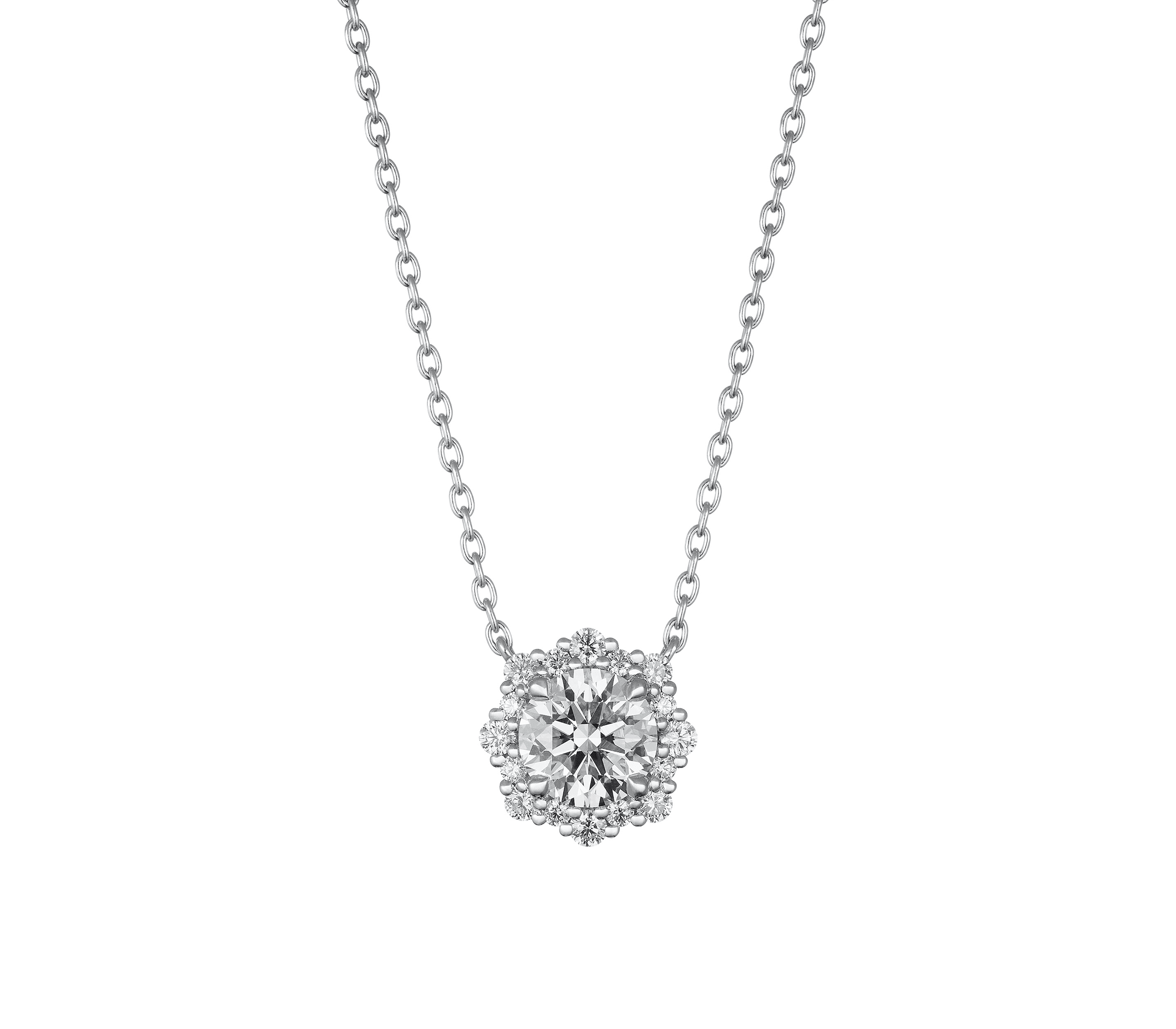 センター・オブ・マイ・ユニバース® フローラル ヘイロー ソリティア ペンダント[センター0.30ct〜、パヴェ計0.08ct〜、チェーン45cm]プラチナ¥473,000〜、ピンクゴールド¥473,000〜 *2023年1月時点での価格 (デビアス フォーエバーマーク)