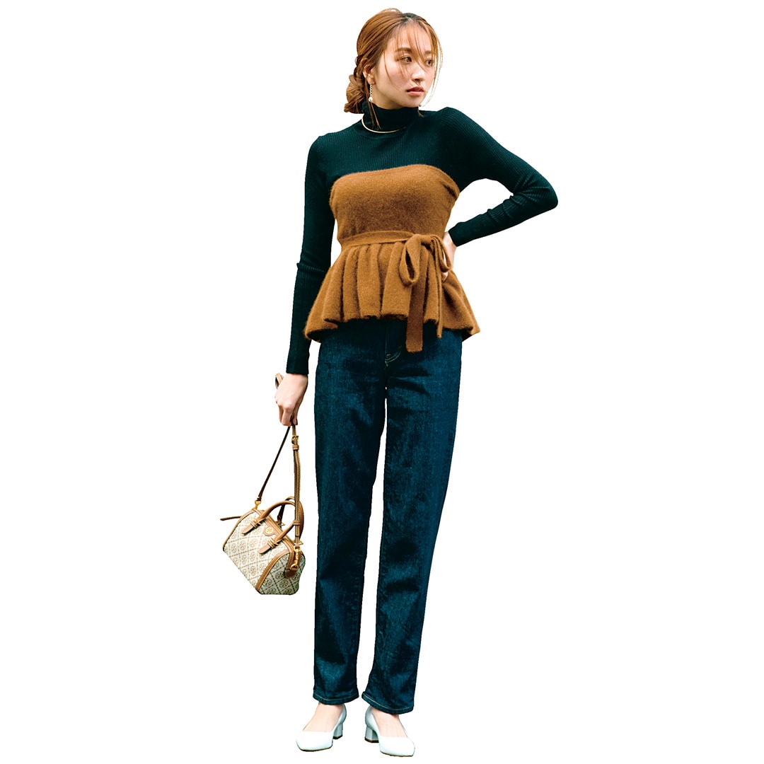 1月29 日(日)、「ニットビスチェ」という主役級アイテムの引き立て役には、どんなアイテムとも好相性な「黒タートル」が重宝します。Tシャツがわりに着られて、コーデが大人な印象に。ミニバッグやパンプスなどフェミニンな小物使いに徹すれば、メンズライクなインディゴデニムが、女性らしいスタイルにアップデートします。