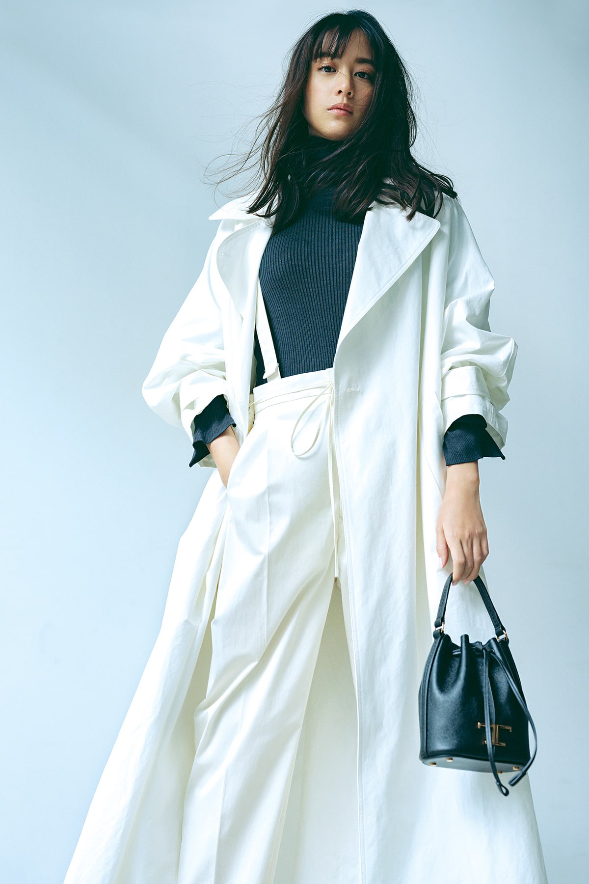 変幻自在な白を主役に、黒のポイント使いでハンサムな印象に。ちらりとのぞくサスペンダーが遊び心と自由なマインドを感じさせる、新しいモノトーンの着こなし。コート¥159,500パンツ¥59,400(ともにドゥロワー/ドゥロワー二子玉川店)ニット¥33,000(カオス/カオス丸の内)バッグ¥184,800(トッズ/トッズ・ジャパン)ピアス〈K18WG╳あこや真珠〉¥169,400イヤカフ[EC限定品]〈SV╳あこや真珠〉¥33,000(ともにミキモト/ミキモト カスタマーズ・サービスセンター)