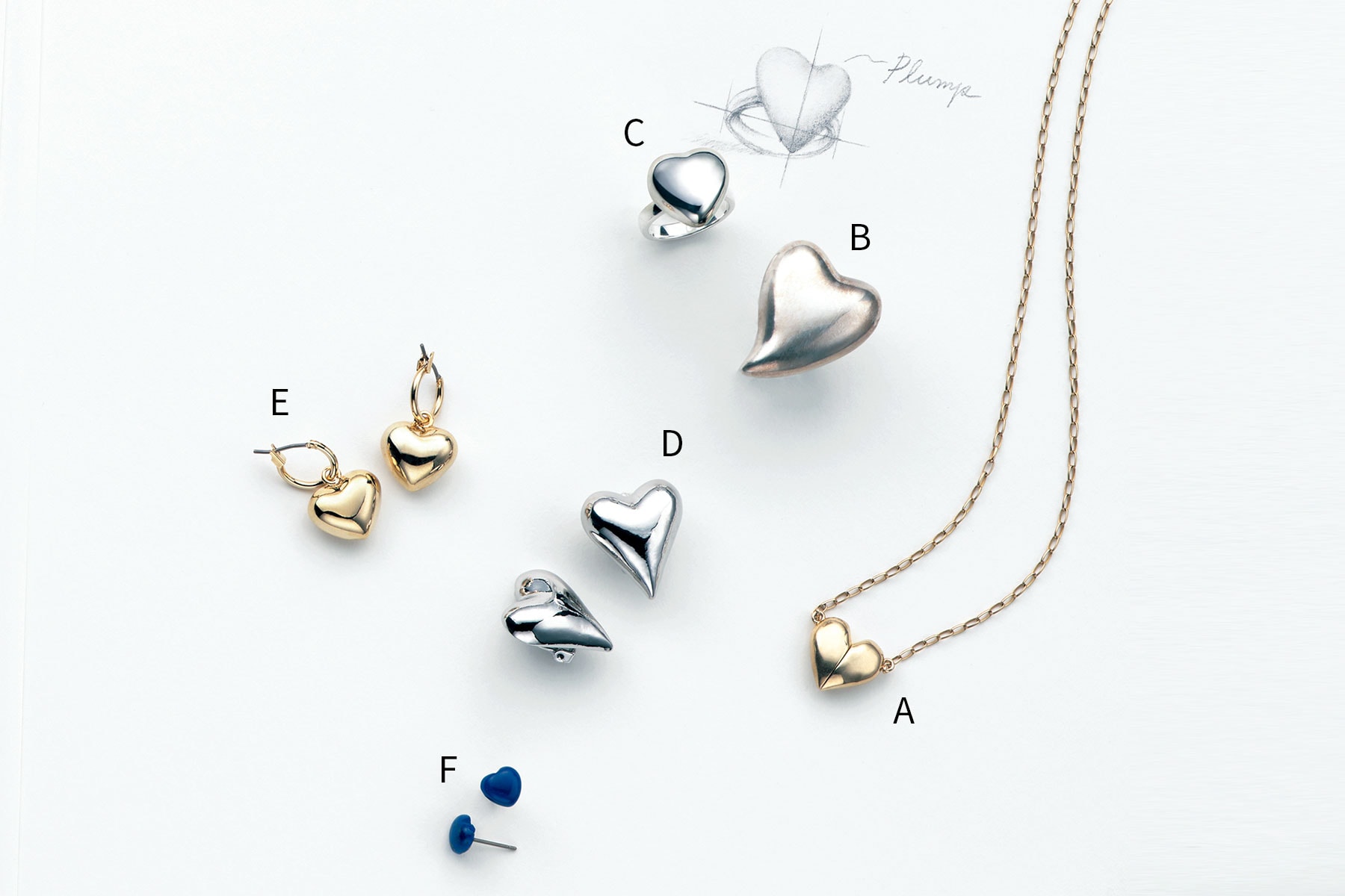 ハートジュエリーブーム再燃のきっかけがこちら。ころんとした形が愛らしいぷっくり感がポイントの〝プランプハート〟は、辛口派も身に着けられるデザイン。ハートの形も、手書きのようなラフさがあったり、丸みがあったり…かっちりしすぎず、ちょっとハズしているのがカジュアルに取り入れやすいポイントです。A.ネックレス¥28,380(ノウハウ/ノウハウ ジュエリー)B.リング¥9,900(ビューティー&ユース×ソワリー/ソワリー)C.リング¥10,230(パズコレクティブ/ZUTTOHOLIC)D.イヤリング¥7,700(アビステ/買えるCLASSY.)E.ピアス¥2,090(アネモネ/サンポークリエイト)F.ラピスラズリピアス¥5,500(オクト)