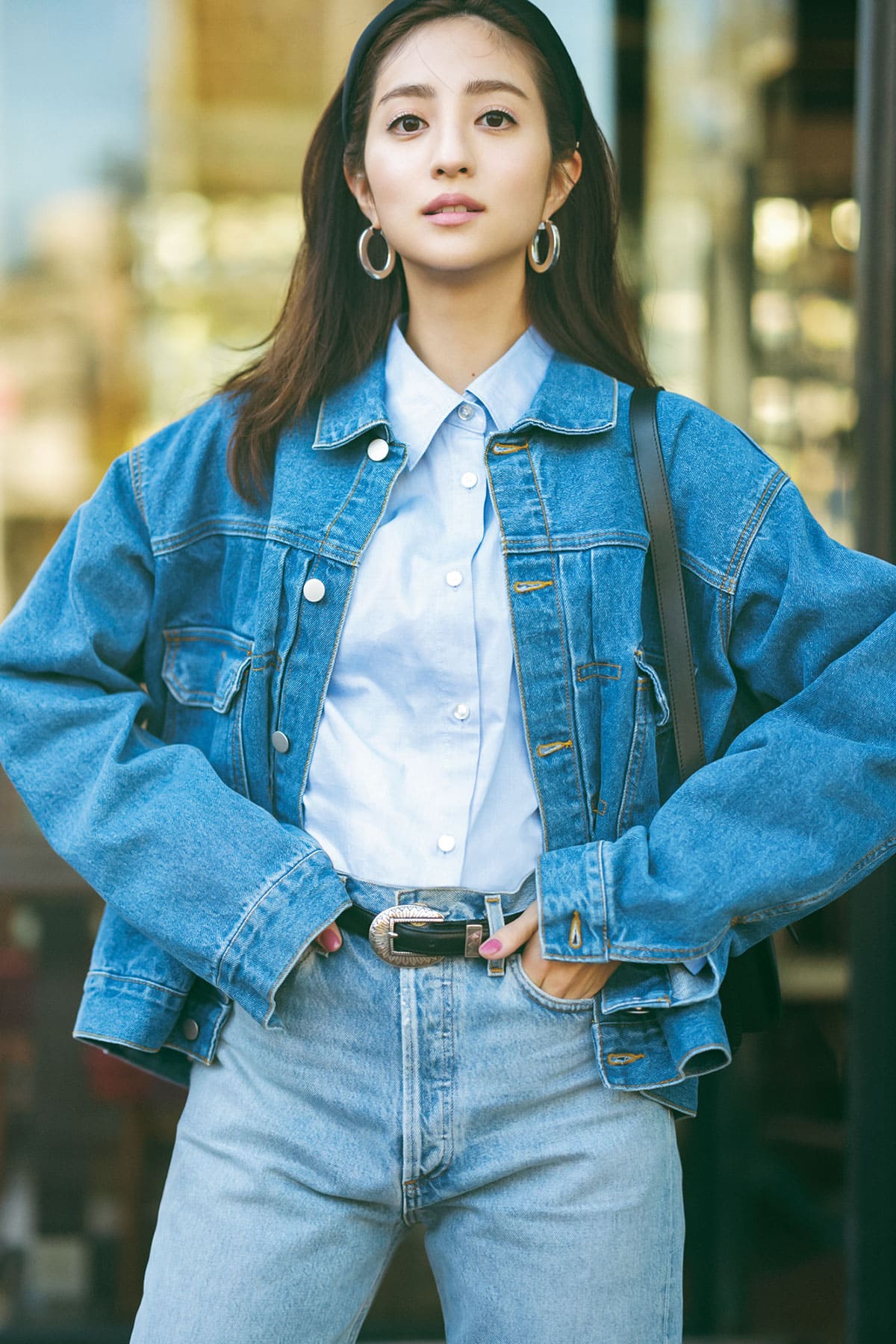 難易度高めのデニムonデニムも、淡いブルーのワントーンでキレイめに。ジャケット¥5,499(WEGO)シャツ¥18,700(アルページュストーリー プレスルーム)パンツ¥30,800(エー・ゴールド・イー/シチズンズ・オブ・ヒューマニティ)ベルト¥29,700(アルベルト ルティ/アマン)カチューシャ¥29,700(アレクサンドル ドゥ パリ/アレクサンドル ドゥ パリ GINZA SIX店)ピアス¥13,200(ウノアエレシルバーコレクション/ウノアエレ ジャパン)バッグ¥102,300(ロンシャン/ロンシャン・ジャパン)