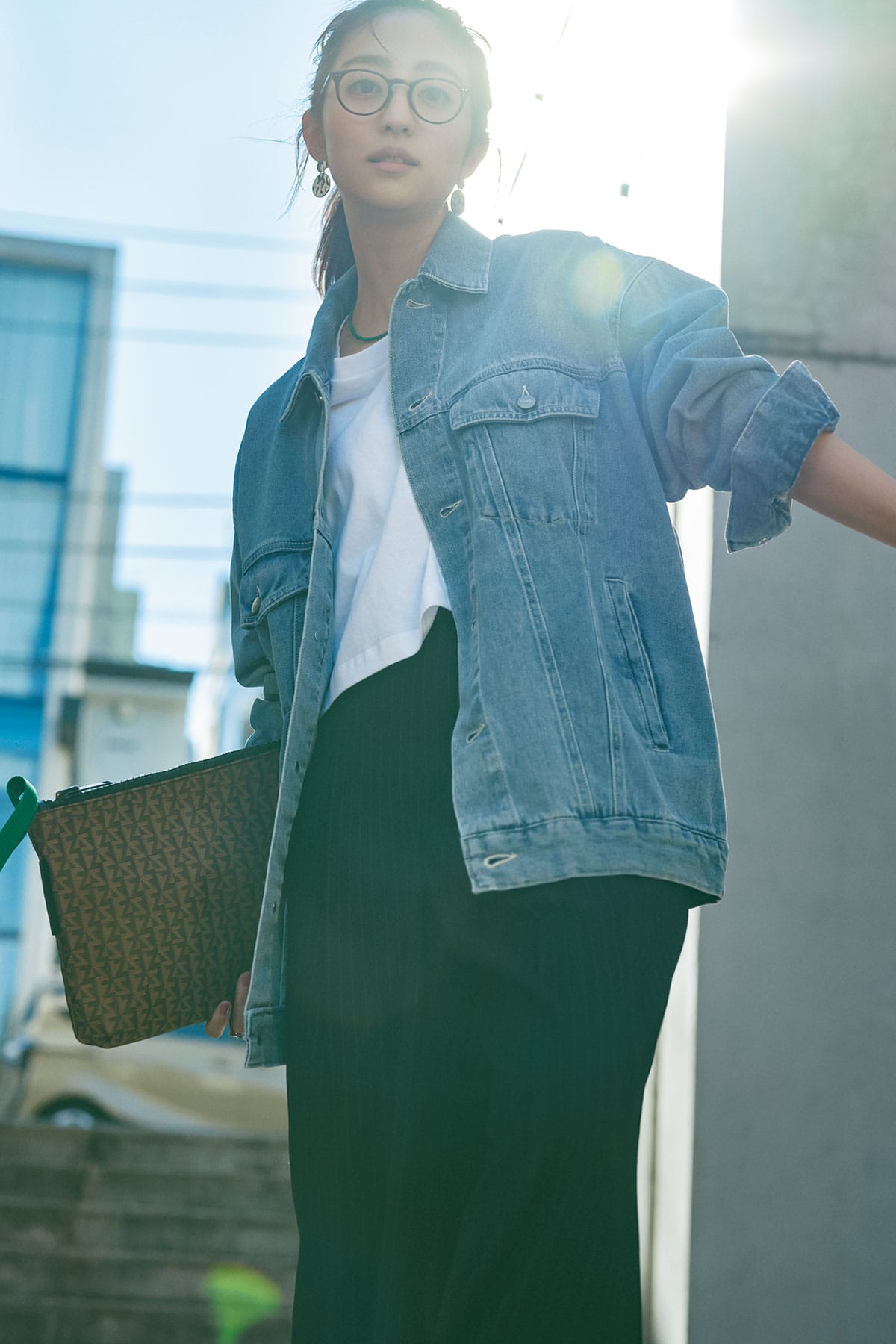 手をかけて上手に色落ちさせたような仕上がりが魅力。モノトーンに合わせてクールに着こなしたい。ジャケット¥6,600(コーエン)Tシャツ¥18,700(コーベルト/THIRD MAGAZINE)パンツ[共布ベルト付き]¥22,000(アルページュストーリー プレスルーム)ベルト¥19,800(メゾン ボワネ/エストネーション)眼鏡¥33,000(アイヴァン/アイヴァン 東京ギャラリー)ネックレス¥19,800(スティーン/フラッパーズ)ピアス¥18,700 リング¥25,300(ともにウノアエレシルバーコレクション/ウノ アエレ ジャパン)バッグ¥39,600(ザンケッティ/八木通商)