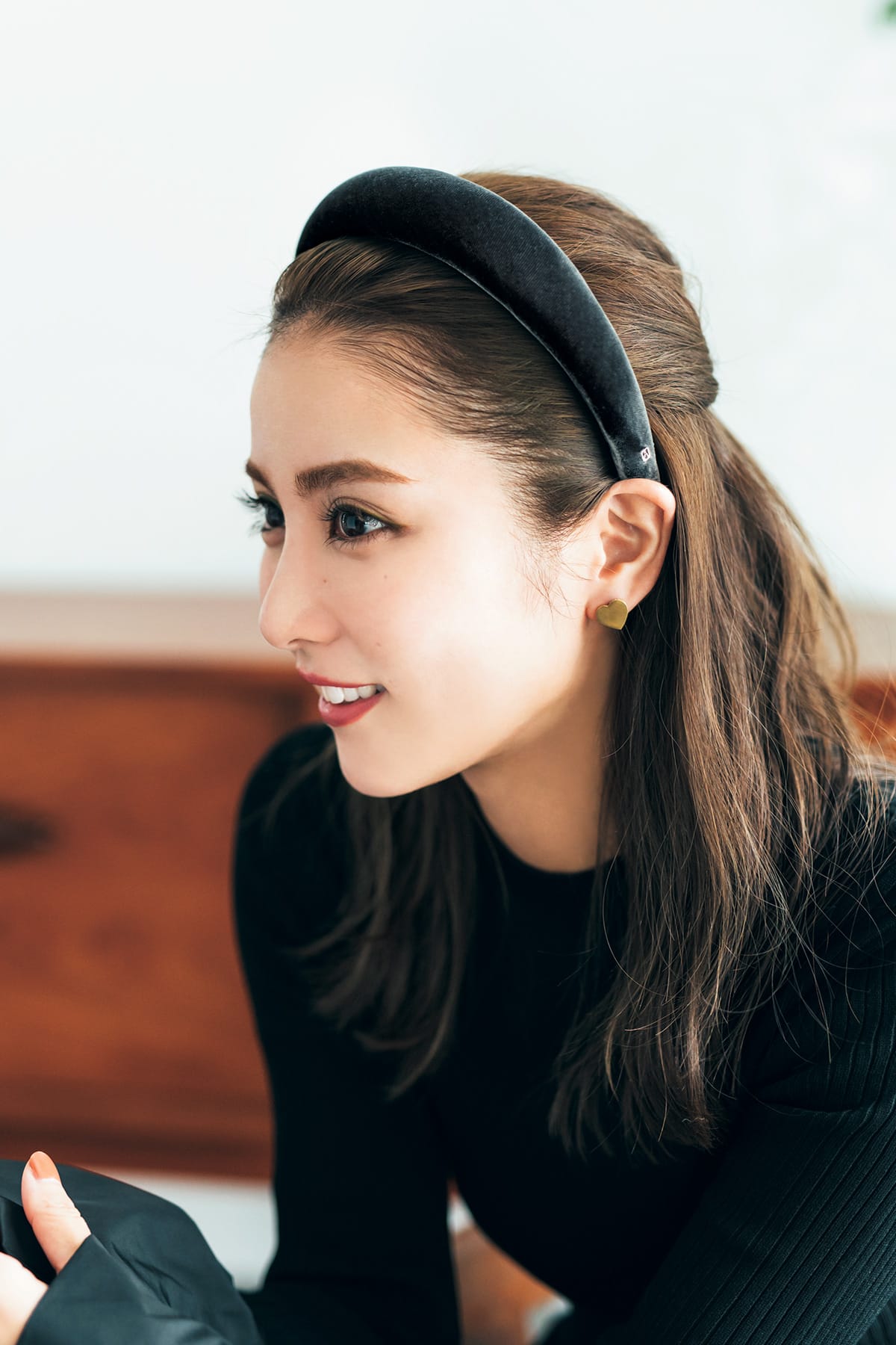 幅だけでなく、厚みもあるボリュームカチューシャなら、ハーフアップなどダウンスタイルに合わせるとバランスが取りやすい。シックな黒コーデに華やかさを添えて、地味見えを回避して。