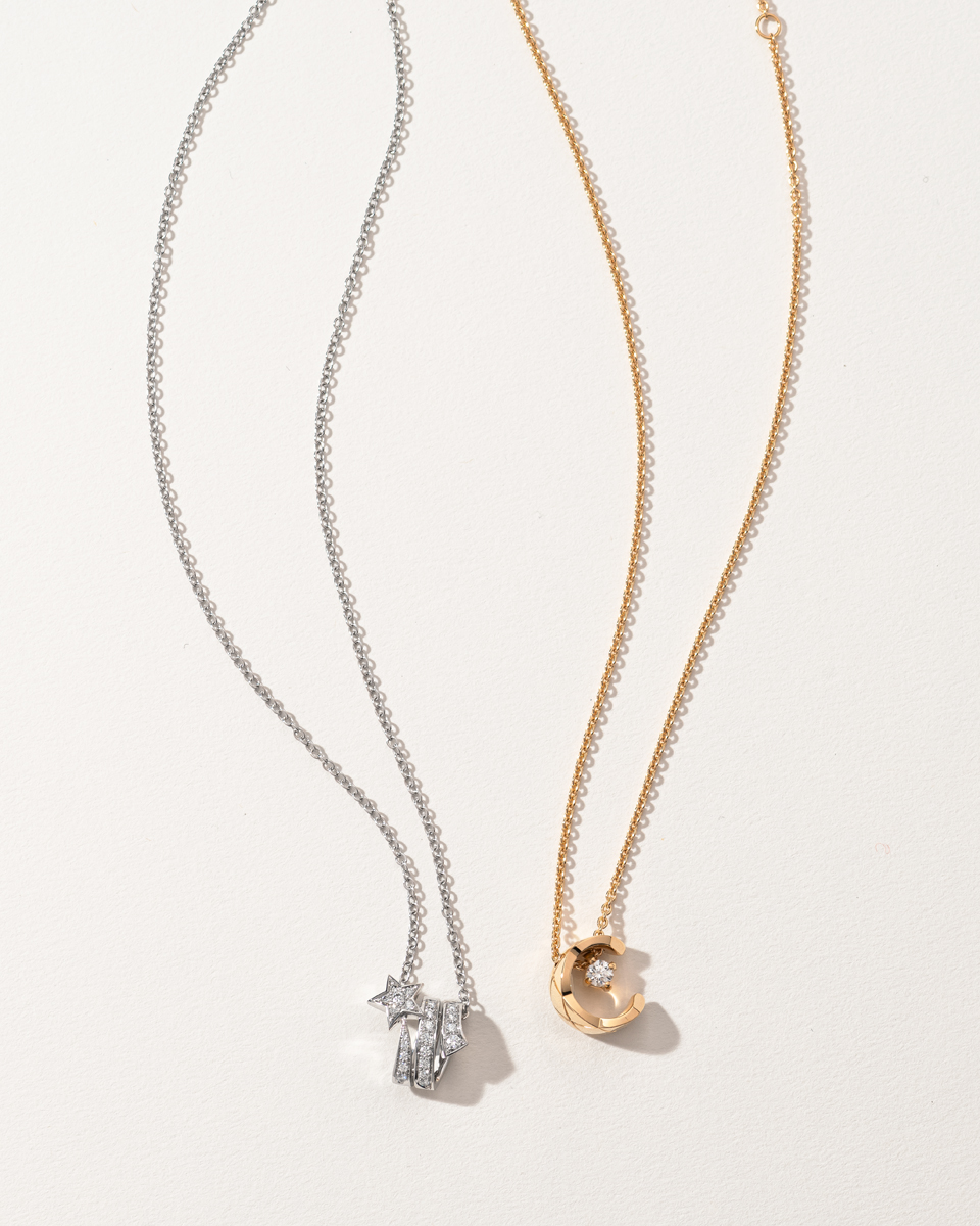 左/彗星を意味するコメットは、1932年のマドモアゼルシャネルによる初のジュエリーコレクションで登場したモチーフ。ダイヤモンドが煌めいて、夜空に流れる星を思わせるロマンティックなモチーフは、ベーシックなトップスの日にこそ選びたい。ネックレス「コメット コレクション」〈WG×DIA〉¥885,500(シャネル)