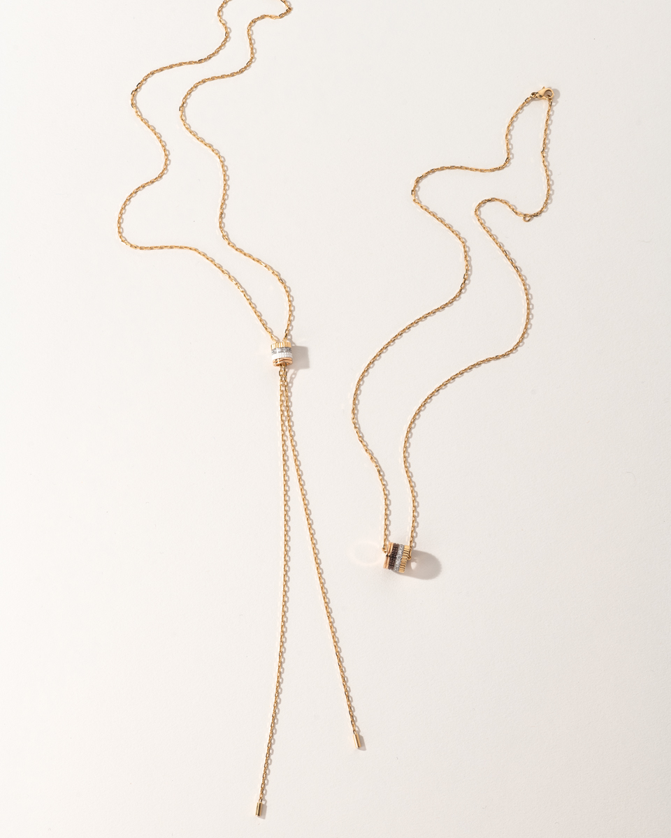 左/メゾンに継承される4つのコードを新解釈し、2004年に発表された「キャトル」コレクション。グラフィカルなモチーフを滑らせることでチェーンを自在アレンジできるタイネックレスは、ハイネックニットやTシャツだけでなく、ボタンダウンシャツの衿元に通すことも。チェーンを背中に垂らせば、ラグジュアリーな後ろ姿に。ネックレス「キャトル ホワイト タイネックレス スモール」〈YG×WG×PG×ホワイトセラミック×DIA〉¥830,500(ブシュロン/ブシュロン クライアントサービス)