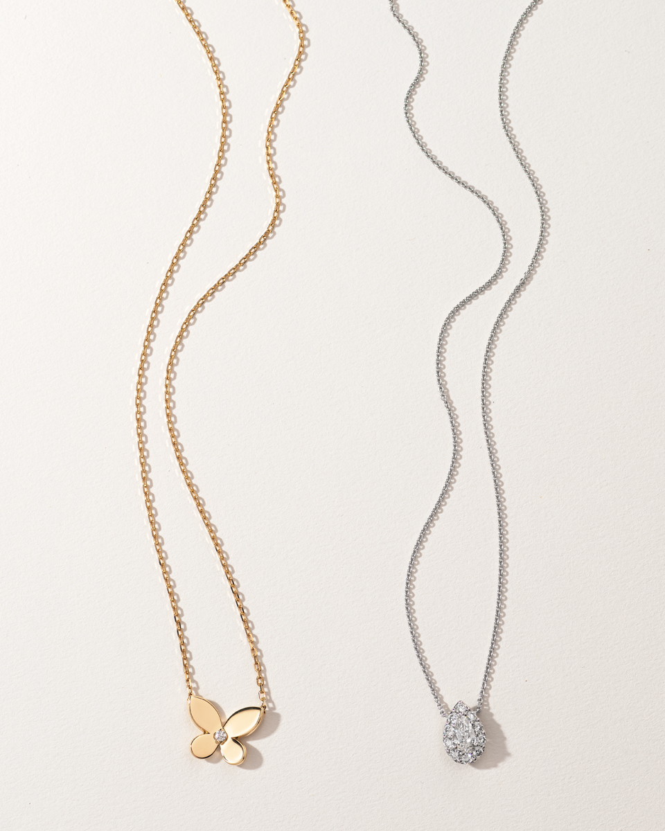 左/アイコニックなバタフライモチーフに、グラフが誇る極上のダイヤモンドをセット。ボリュームのあるゴールドの羽は、光を捉え、最大限輝くようクリエイト。ラグジュアリーで可憐なバタフライを携えて、毎日のオシャレをもっとポジティブに楽しみたい。ネックレス「ザ グラフ バタフライ」〈YG×DIA〉¥480,000(グラフ/グラフダイヤモンズジャパン)
