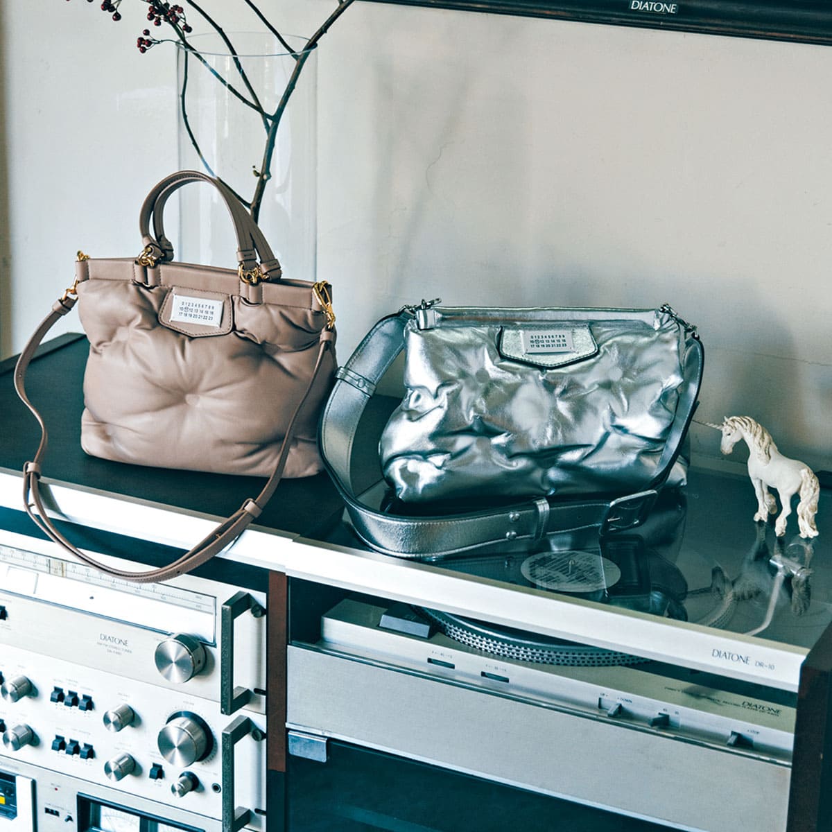 2018年の登場以来、ブランドの顔となるアイコニックなシリーズ。とろけるようなナッパレザーをキルティングに仕立て、シンプルかつ印象的なたたずまいを表現。さりげなくエッジィさを醸し出す、さすがのフォルムが美しい。バッグ「グラム スラム」左〈H21×W26×D10㎝〉¥273,900 右〈H20 ×W31×D12㎝〉¥279,400(ともにメゾン マルジェラ/マルジェラ ジャパン クライアントサービス)