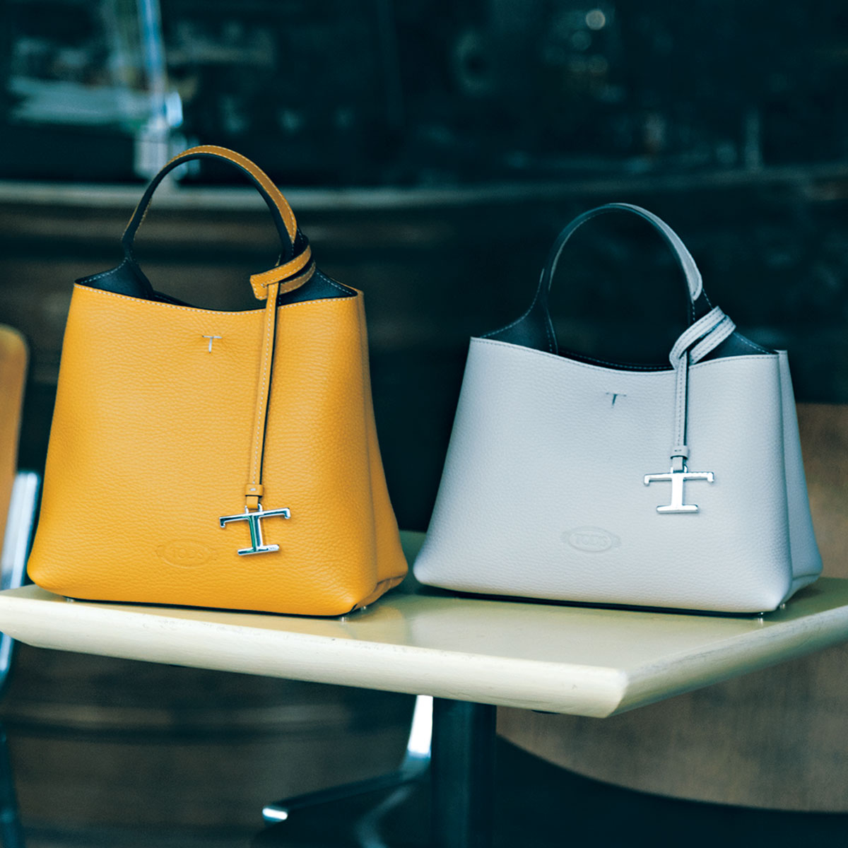 メタルパーツを多用せず、レザーの風合いを前面に押し出したソフトなフォルムのミニバッグ。幅広のマチで、パッと見の印象よりもたっぷり入るのも優秀。中はファスナーポケットになった仕切りでふたつに仕切られており、スマートに収納できるのもポイント。バッグ左〈H20×W22×D13.5㎝〉¥149,600 右〈H17×W25×D14.5㎝〉¥149,600(ともにトッズ/トッズ・ジャパン)