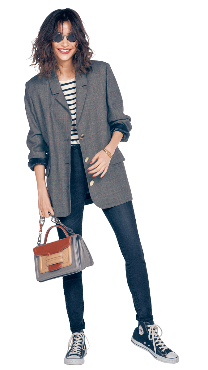 ジャケット¥75,000(メゾン キツネ/メゾン キツネ カスタマーセンター)カットソー¥11,000〈ルミノア〉パンツ¥19,000〈レッドカード〉(ともにゲストリスト)バッグ¥185,000(ピエール アルディ/ピエール アルディ 東京)スニーカー¥5,800(コンバース/コンバースインフォメーションセンター)サングラス¥43,000(アイヴァン 7285/アイヴァン 7285 トウキョウ)バングル[細]¥30,000[太]¥42,000(ともにプリュイ/プリュイ トウキョウ)