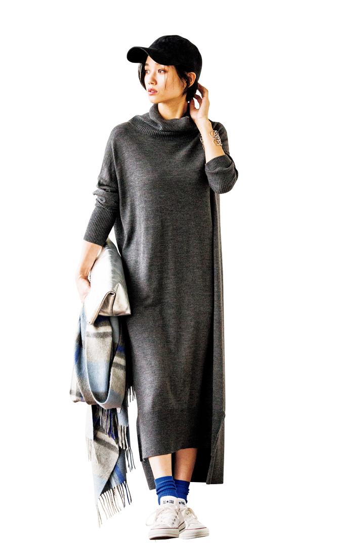 ニットワンピにデニムをレイヤードして、自然体なカジュアル感を。フォックスファーバッグ¥68,000(ラドロー/阪急うめだ本店)スニーカー¥5,800(コンバース/コンバースインフォメーションセンター)ピアス¥12,000(アビステ)バングル¥6,500(JUICY ROCK)