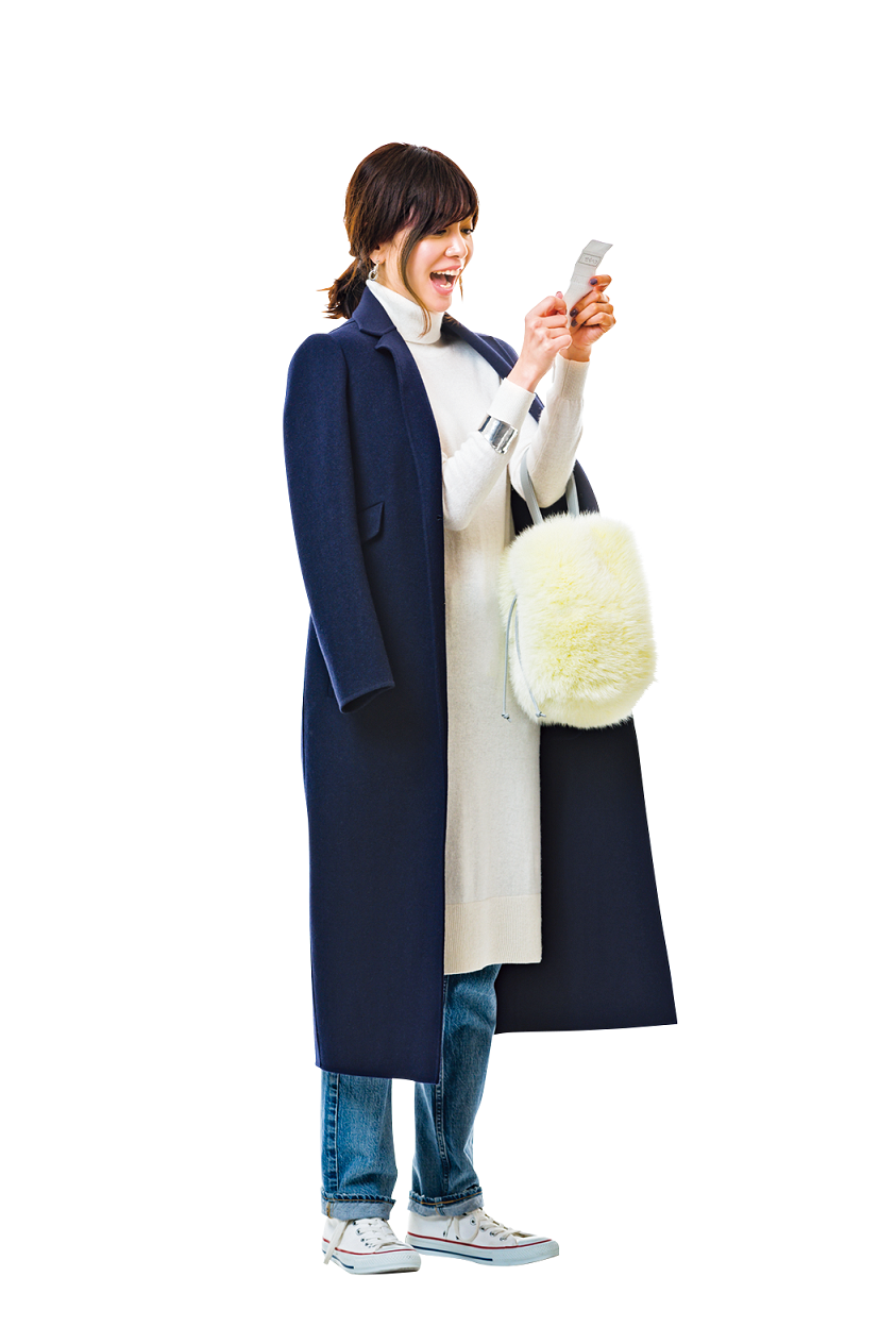 リブニットパンツ¥15,000(MACPHEE/TOMORROWLAND)カーディガン¥31,000(ウィム ガゼット/ウィム ガゼット 丸の内店)Tシャツ¥3,800(Mila Owen)ファーバッグ¥68,000(ラドロー/ユナイテッドアローズ 六本木ヒルズ店)スニーカー¥5,800(コンバース/コンバースインフォメーションセンター)ネックレス¥84,000〈ソフィー ブハイ〉バングル¥68,000〈スカイ ブルー ホーク〉(ともにバーニーズ ニューヨーク カスタマーセンター)