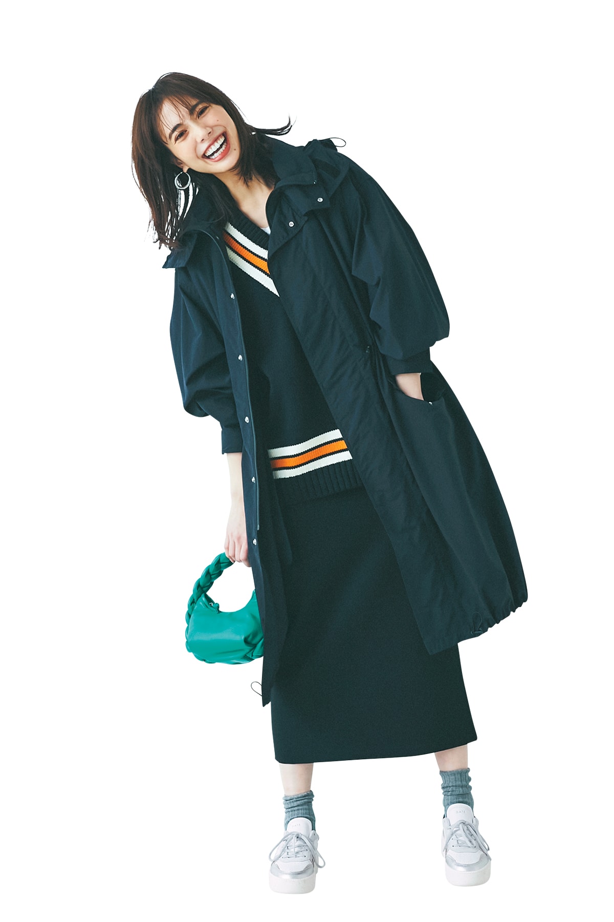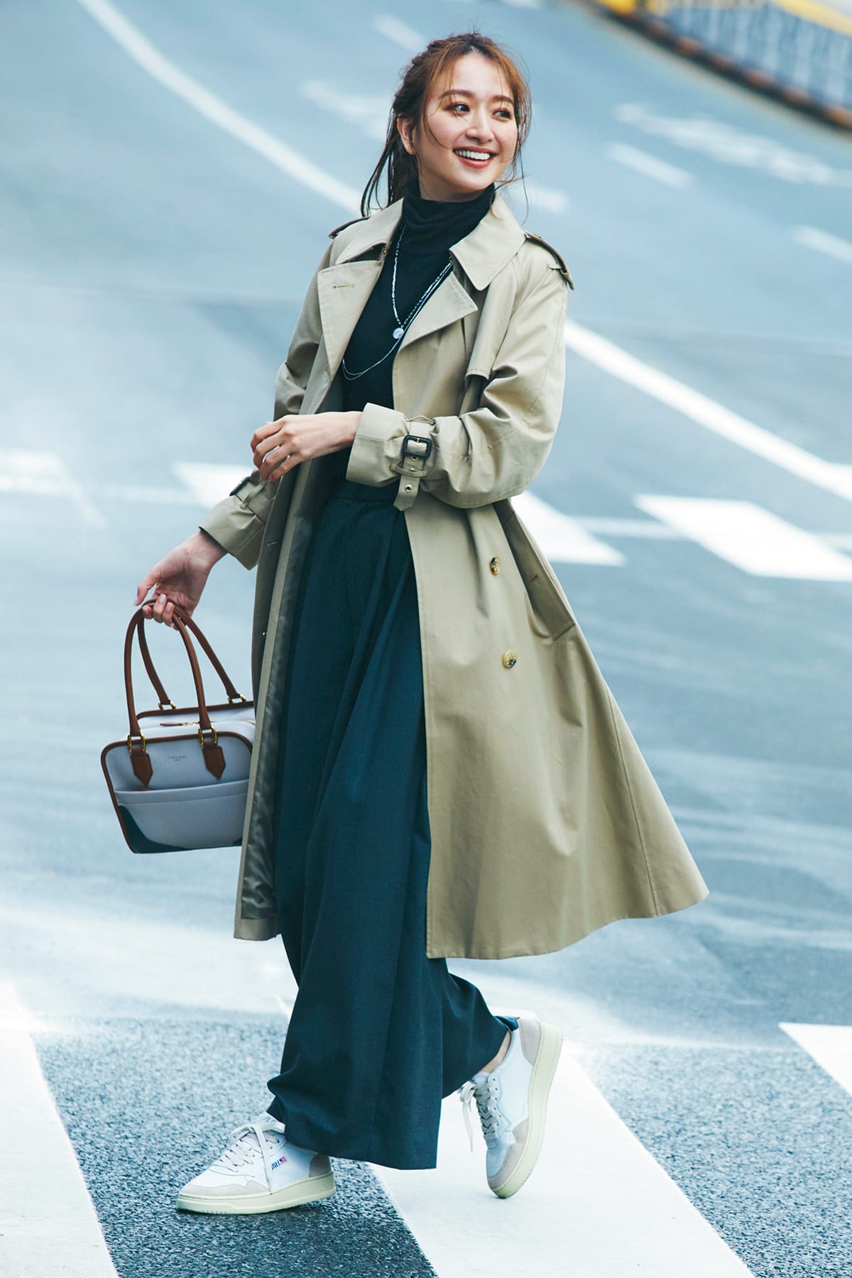 スムースレザーとスエードのコンビが上品だから、きれいめ通勤コーデにもぴったり。スニーカーのボリューム感に合わせてワイドパンツを選ぶのがベストバランス。スニーカー¥27,500(オートリー/トヨダトレーディング プレスルーム)トレンチコート¥184,800(マッキントッシュ/マッキントッシュ ギンザシックス店)タートルニット¥4,290(オリヒカ/オリヒカ池袋東口店)パンツ¥42,900(エイトン/エイトン青山)バッグ¥195,800(J&Mデヴィッドソン/J&Mデヴィッドソン カスタマーセンター)コインネックレス¥28,600 2連ネックレス¥22,000(ともにマリハ)