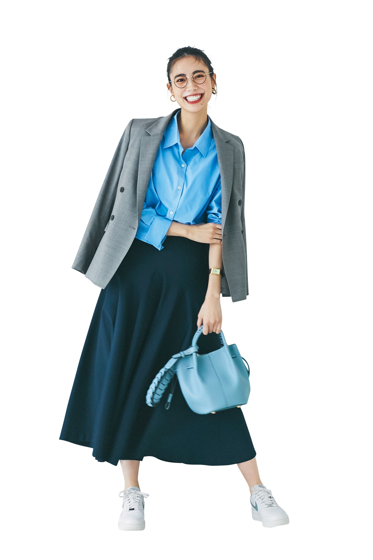 この「エア フォース 1 ネクスト ネイチャー」は、リサイクル素材を重量の20%以上使用。スニーカー¥13,200(ナイキ スポーツウェア/NIKE カスタマーサービス)ジャケット〈2月上旬発売〉¥29,700(ザ・スーツカンパニー/ザ・スーツカンパニー 新宿本店)シャツ¥7,990(アンフィーロ)スカート¥28,600(ボールジィ/TOMORROWLAND)バッグ¥19,800(サマンサタバサ/サマンサタバサ ルミネ新宿店)めがね¥50,600(アイヴァン/アイヴァン 東京ギャラリー)イヤリング¥6,510(アビステ)時計¥31,900(リップ/エイチエムエスウォッチストア 表参道)
