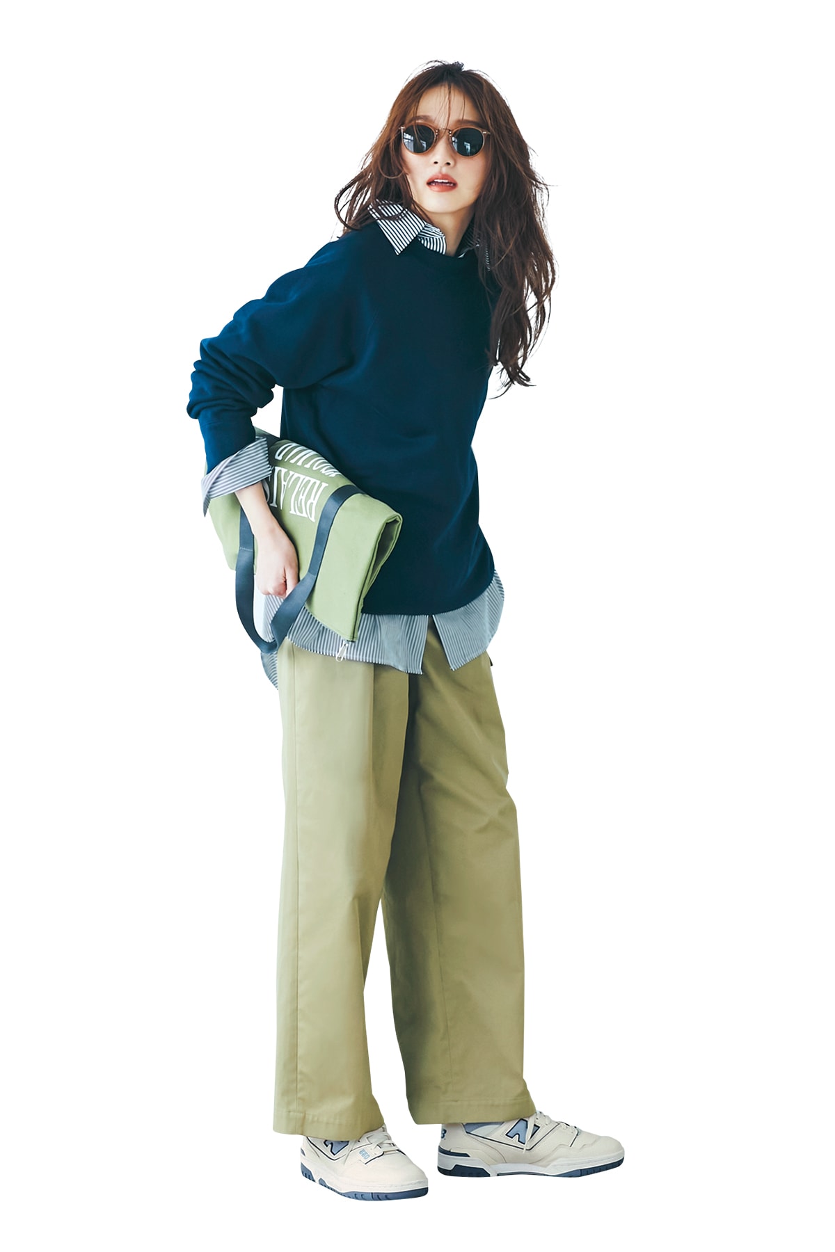 大人気のニューバランス、次に買うならこちら!’80年代にリリースされたバスケットシューズを復刻した「BB550」。優しいカラーリングとヴィンテージ感漂うソールのデザインが、きれいめカジュアルになじんでくれます。スニーカー¥16,500(ニューバランス/ニューバランスジャパンお客様相談室)スウェット¥37,400(エイトン/エイトン青山)シャツ¥8,910(Mila Owen/Mila Owen ルミネ新宿2店)パンツ¥33,000(タンジェント)バッグ¥16,500(ノマディス)サングラス¥42,900(アイヴァン/アイヴァン 東京ギャラリー)