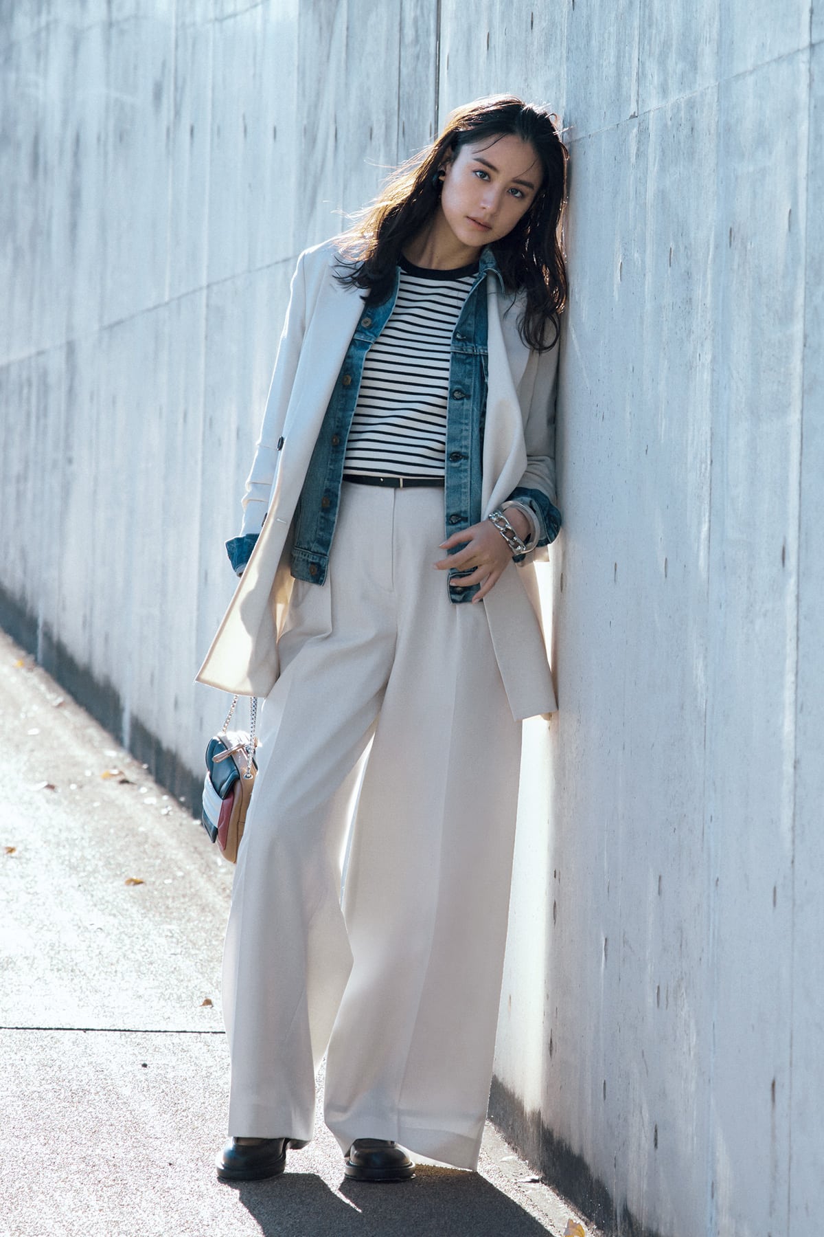 2.【デニム×シックアウター】キレイめなアウターと合わせる!