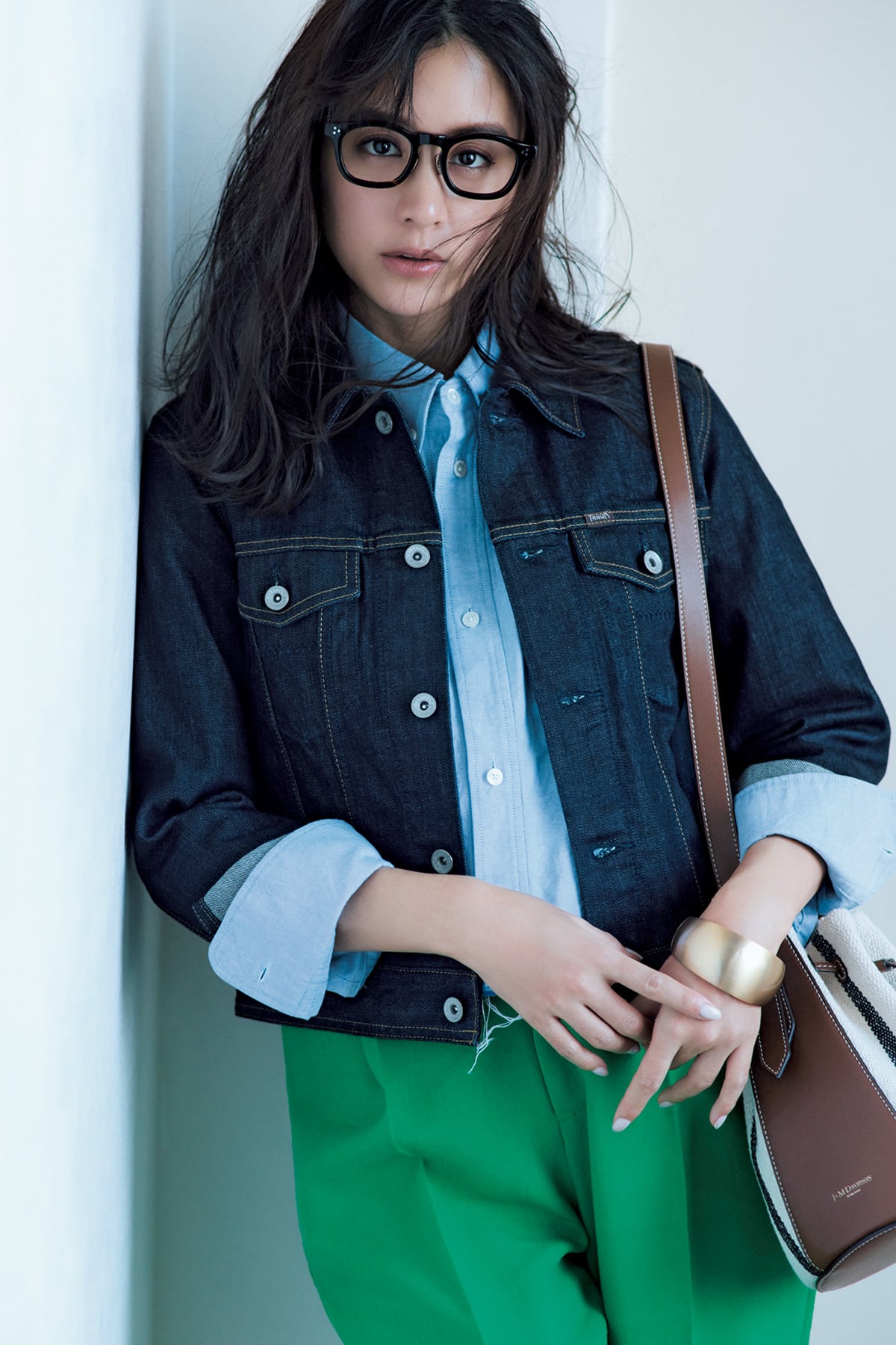Gジャンの中ではキレイめな雰囲気で着られる、濃色リジッドデニム。中に合わせるシャツは、ボタンを上まで留めて抜けを作らないのが今っぽく仕上げるポイント。Gジャン¥33,000(ヤヌーク/カイタックインターナショナル)シャツ¥30,800(ジェーンスミス/RHC ロンハーマン)パンツ¥36,300(ロンハーマン)バッグ¥137,500(J&M デヴィッドソン/J&M デヴィッドソン カスタマーセンター)メガネ¥50,600(アイヴァン/アイヴァン 東京ギャラリー)バングル¥9,900(アビステ)