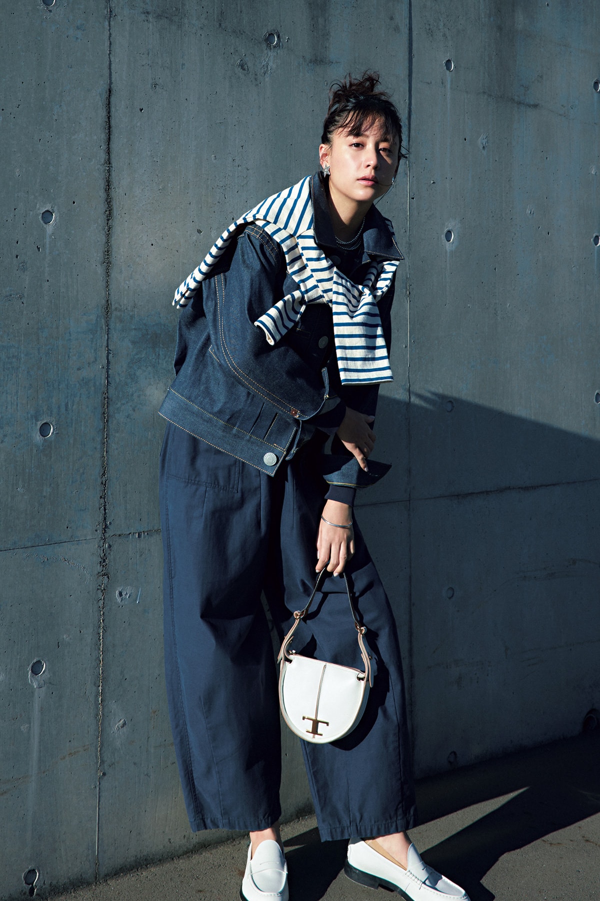 落ち着きのあるネイビーワントーンをマリンテイストへ導く、ボーダー柄と白小物。Gジャン¥46,200〈クーキーズ〉イヤリング¥34,100〈ハルポ〉ネックレス¥46,200〈インディアンジュエリー〉ネックカフ¥47,300バングル¥26,400〈ともにロンハーマン ジュエリー〉(すべてロンハーマン)ロンT¥20,900(エイトン/エイトン青山)パンツ¥31,900(RHC/RHC ロンハーマン)肩に掛けたカットソー¥23,100(ユニオン ランチ/サザビーリーグ)バッグ¥169,400ローファー¥80,300(ともにトッズ/トッズ・ジャパン)