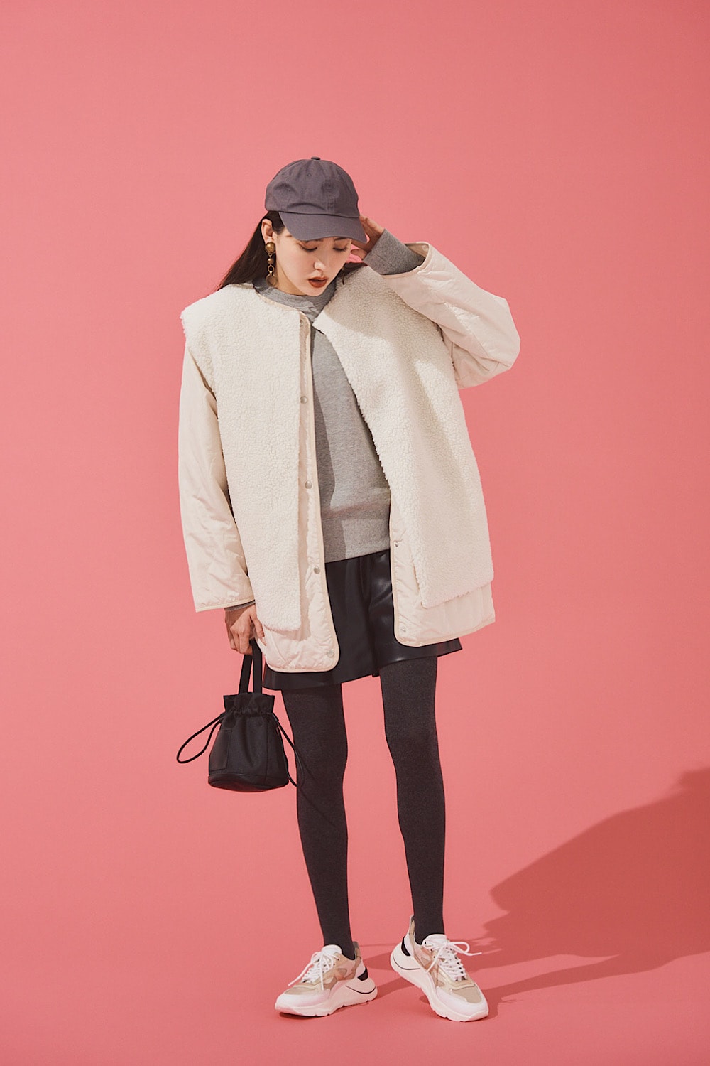 チャコールグレータイツ¥990(無印良品/無印良品ネットストア)ボアベスト×キルティングブルゾンセット¥12,000(Olu.)スウェット¥14,300(エリオポール/エリオポール代官山)レザーショートパンツ¥18,700(カデュネ/カデュネ プレスルーム)キャップ¥5,500(アッパーハイツ/ゲストリスト)バッグ[一部店舗のみで販売]¥1,990(GU)スニーカー[JAPAN限定]¥39,600(デイト/ティースクエア プレスルーム)イヤリング¥15,750(アビステ)