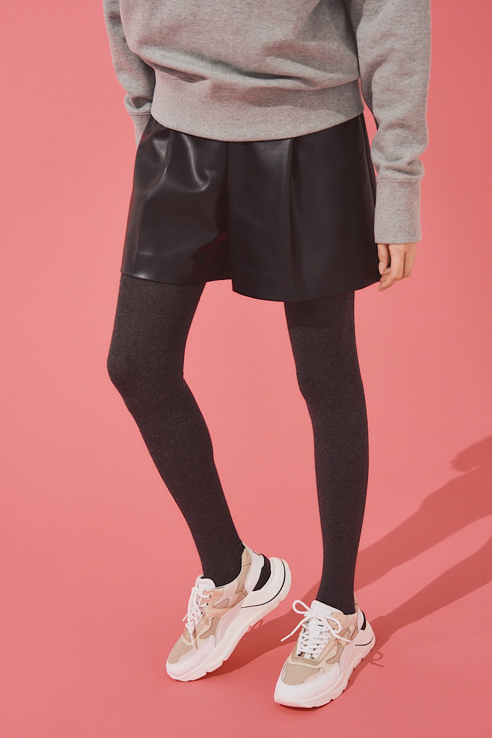 今回使用したタイツは、透けない綿素材。ほっこりしがちな厚手のダークカラータイツは、異素材のレザーショーパンを活用すれば軽やかに。生地のツヤがタイツのカジュアルな雰囲気を和らげて、女性らしさを底上げしてくれます。