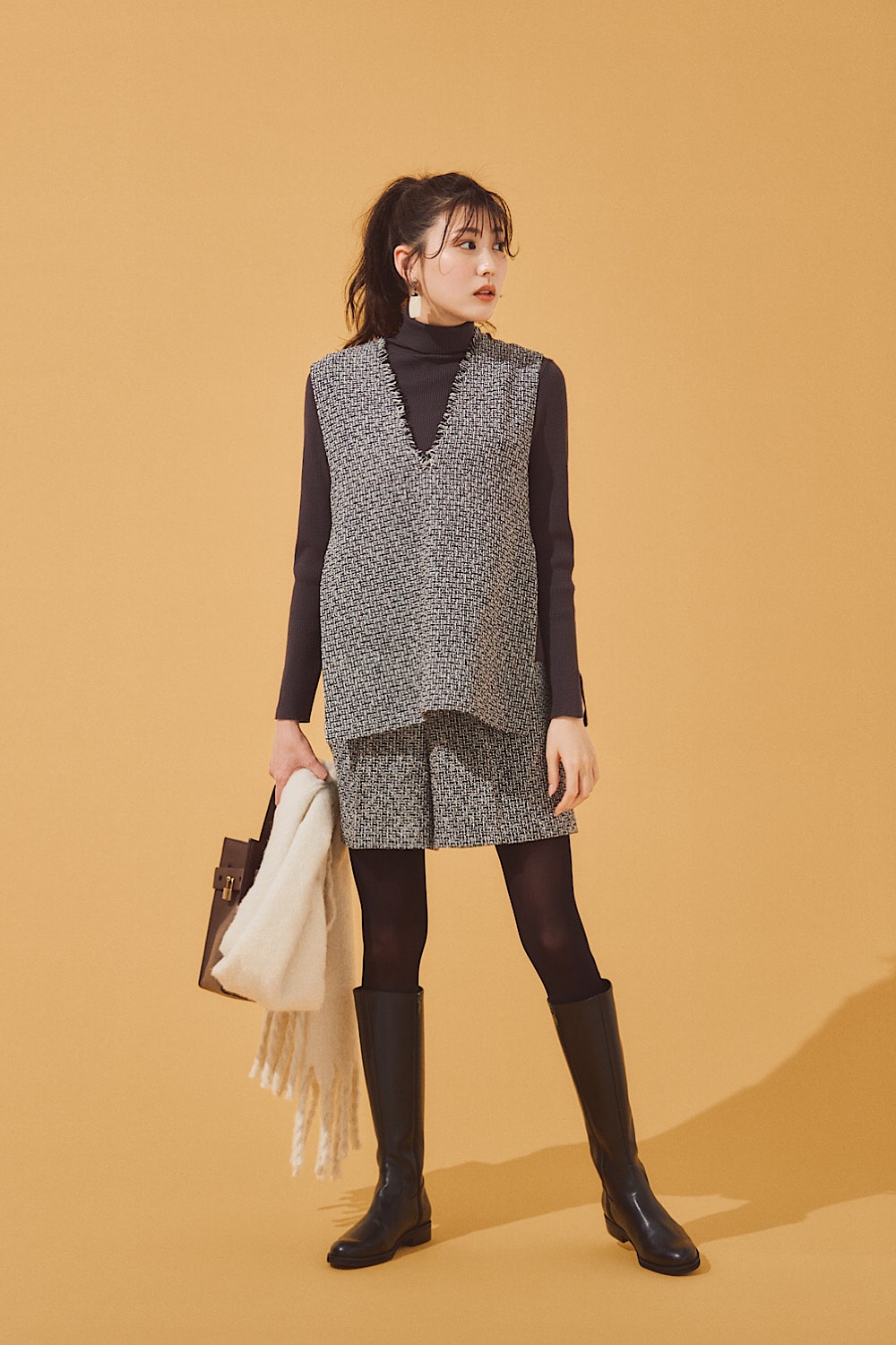 黒40デニールタイツ¥1,320(Tabio/タビオ)ツイードベスト¥15,400タートルネックニット¥10,780ツイードショートパンツ¥18,700(すべてカデュネ/カデュネ プレスルーム)バッグ¥37,400(オルセット/オルサ)ストール¥4,400(アーノルド パーマー/水甚)ロングブーツ¥29,700(ダイアナ/ダイアナ 銀座本店)イヤリング¥12,600(アビステ)