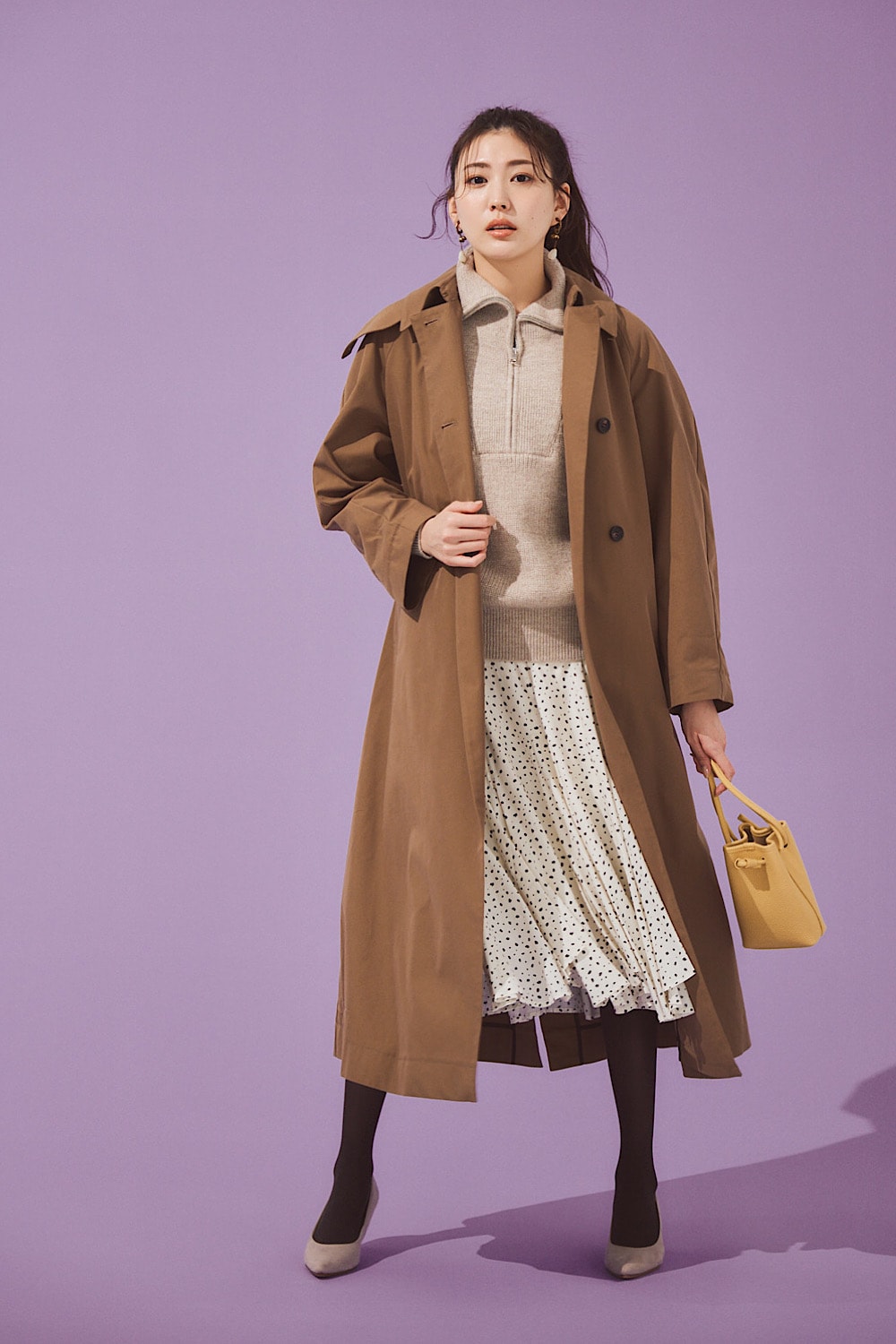 ダークセピア55デニールタイツ¥1,760(17℃/17℃ by Blondoll 横浜ジョイナス店)コート¥37,400(アルページュストーリー/アルページュストーリー プレスルーム)ニット[予定価格]¥33,000(アイリス & インク/THE OUTNETカスタマーケア)スカート¥22,000(カデュネ/カデュネ プレスルーム)バッグ¥31,900(ヴァジック/ヴァジックジャパン)パンプス¥8,910(マミアン/マミアン カスタマーサポート)イヤリング¥12,600(アビステ)