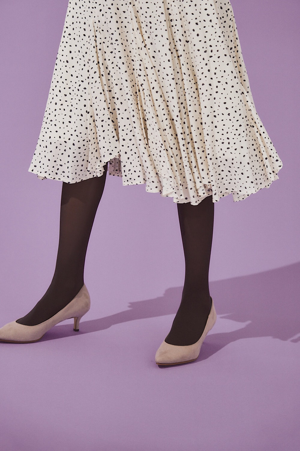 今回使用したのは、絶妙なカラーリングのタイツが多く揃う「17℃」のもの。網目がしっかりしていて、厚さは透けすぎないくらいの55デニールです。ほんのり赤みがかったブラウンには、ベージュのパンプスを合わせて、やさしく配色をなじませます。