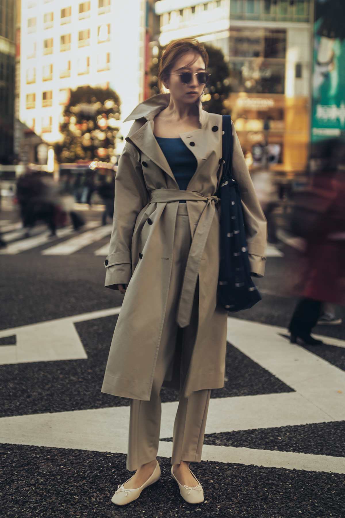 今季注目のスクエアネックはトレンチのインナーにも好相性。トレンチコート¥25,300パンツ¥11,550(ともにミラオーウェン/Mila Owen ルミネ新宿2店)ニット¥24,200(エストネーション)バッグ¥37,400(アスペジ/トヨダトレーディング プレスルーム)バレエシューズ¥7,200(チャールズ&キース/チャールズ&キース ジャパン)サングラス¥42,900(アイヴァン 7285/アイヴァン 7285 トウキョウ)