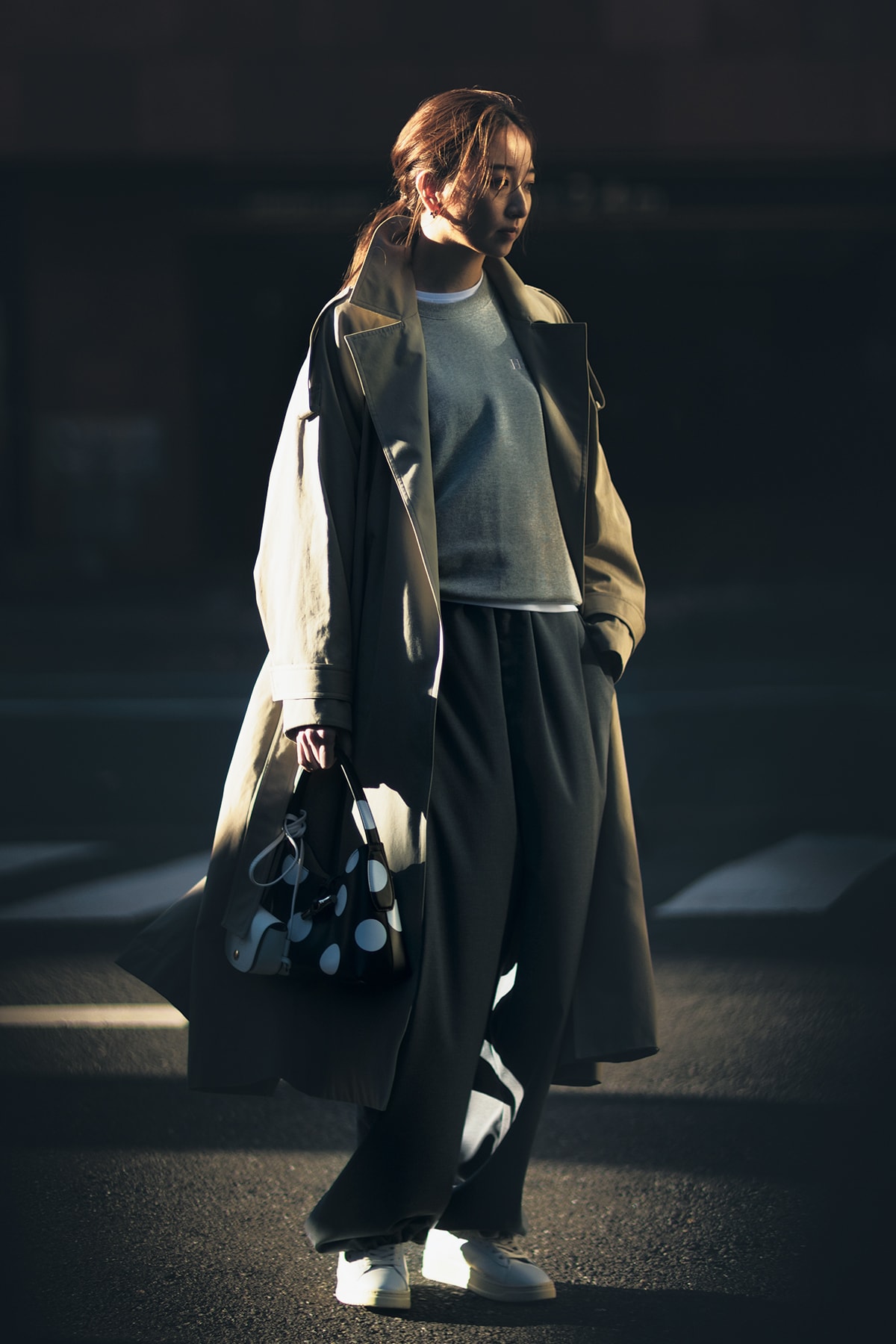 スウェットやスニーカーで着崩すのも〝モブにならない〟秘訣。トレンチコート¥143,000(エブール/ebure GINZA SIX店)スウェットトップス¥14,300〈エリオポール〉パンツ¥33,000〈セラードア〉(ともにエリオポール代官山)Tシャツ¥6,000(バナナ・リパブリック)ドットバッグ¥67,100白バッグ¥27,500(ともにロンシャン/ロンシャン・ジャパン)スニーカー¥27,500(オートリー/トヨダトレーディング プレスルーム)ピアス¥19,800(AGMES/エスケーパーズオンライン)