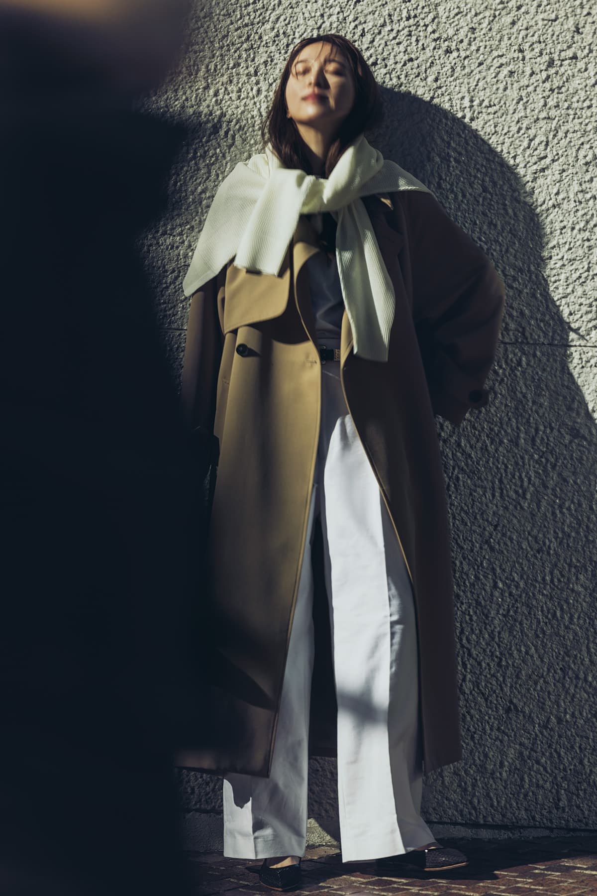 肩掛けするニットは、コートの中に着てもコーデが成立するものを選ぶのが鉄則。トレンチコート¥39,600※3月上旬発売予定(ミースロエ)Tシャツ¥15,400(サクラ/インターリブ)パンツ¥48,400〈ベルナール ザンス〉バッグ¥45,100〈ヴァジック〉シューズ¥36,300〈ファビオ ルスコーニ〉(すべてトゥモローランド)ニット¥8,990(アンフィーロ/オンワード樫山)ベルト¥35,200(J&M デヴィッドソン/J&M デヴィッドソン カスタマーセンター)