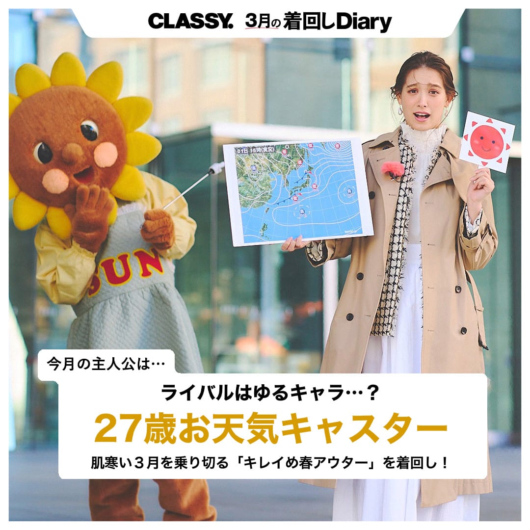 日によって春と冬の気候に行ったり来たりする3月。毎日の洋服選びが、特に難しい季節です。この時期ならではのお悩みに一緒に立ち向かう今月の主人公は、お天気キャスター。春アウターを上手に取り入れながら、強敵に立ち向かいます!