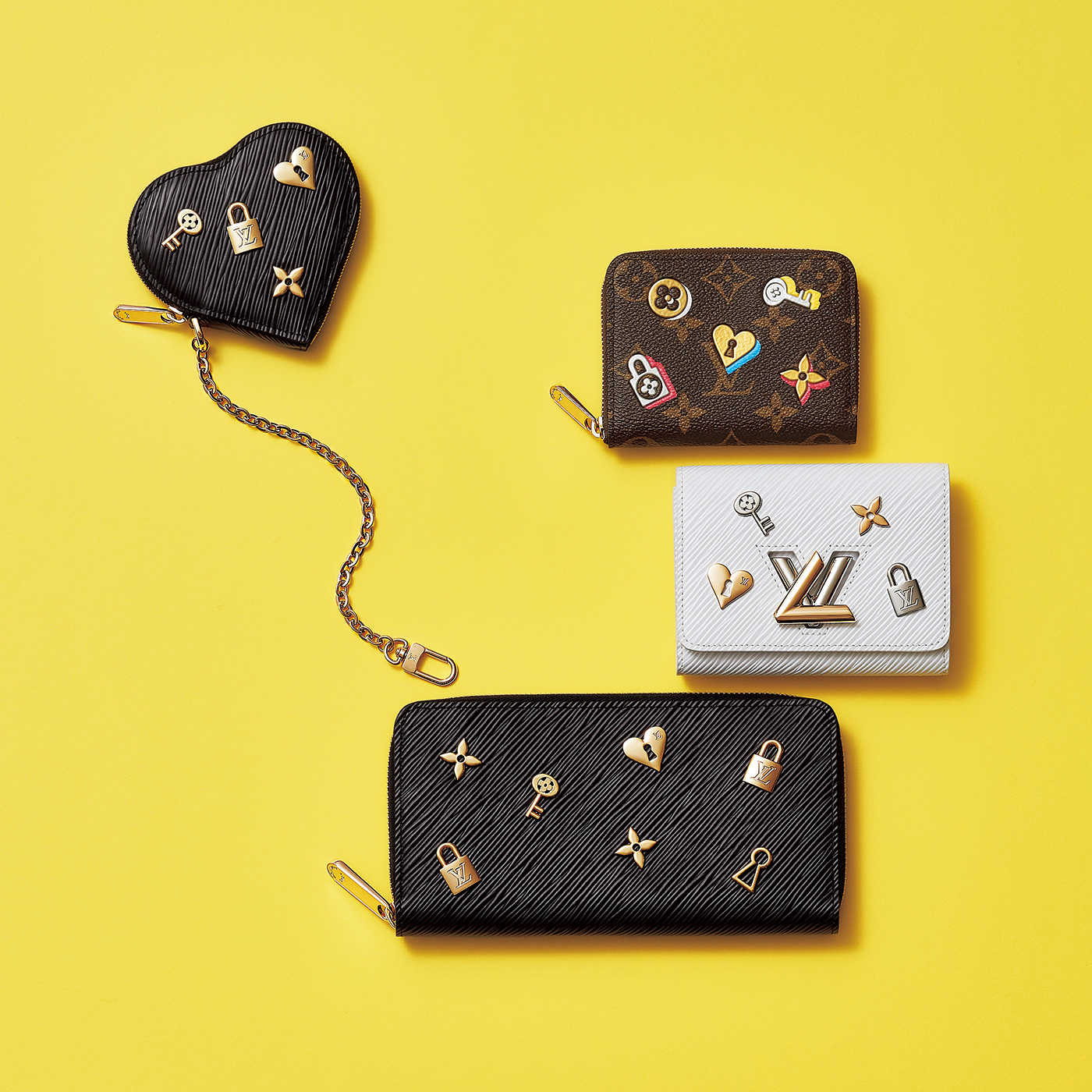 ブラックやホワイトのエピ・レザーに小ぶりなパドロックとモノグラム・フラワーのモチーフが楽しげ。一方、モノグラム・キャンバスにはゴールドやシルバーだけでなくカラフルな色をあしらっているのがチャーミング。