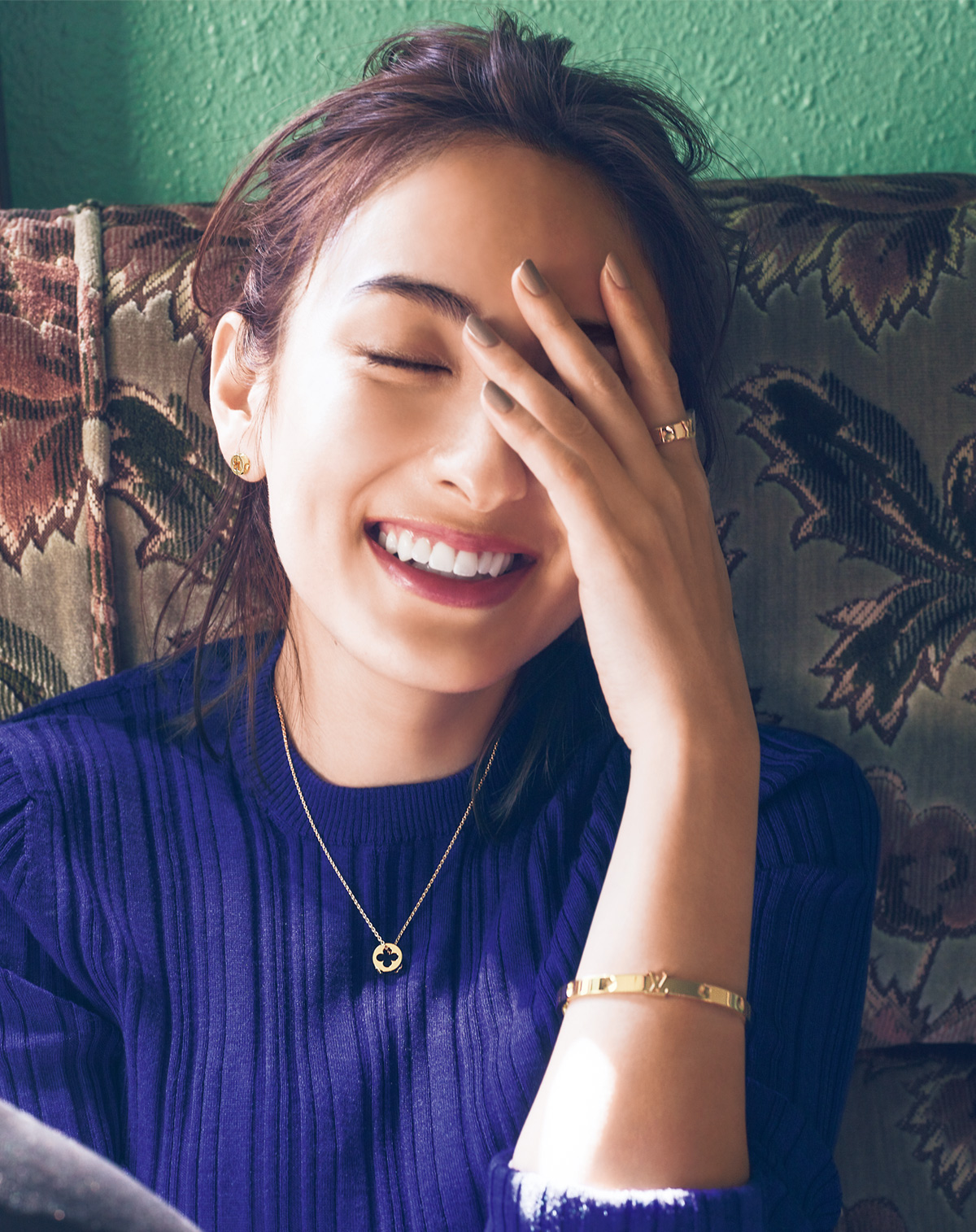 ピアス「ピュス アンプラント」〈K18YG〉¥160,000 ネックレス「パンダンティフ アンプラント」〈K18YG〉¥229,000 バングル「バングル アンプラント LV」〈K18YG〉¥675,000 リング「バーグアンプラント LV」〈K18YG〉¥179,000 リブニット¥95,000(すべてルイ・ヴィトン/ルイ・ヴィトン クライアントサービス)