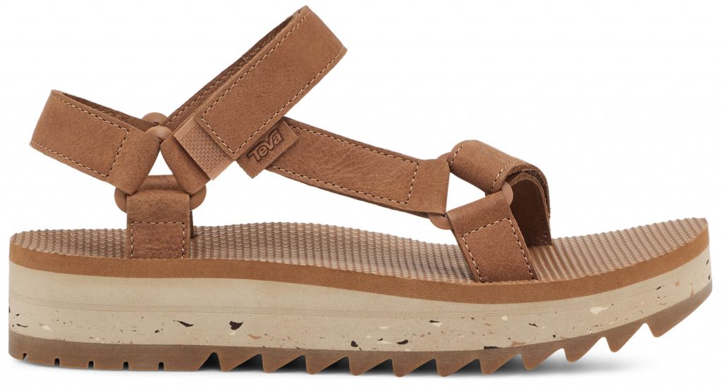 アイコニックなユニバーサルストラップに柔らかいレザーを採用した新モデル。レザーは環境に配慮した持続可能で適切なビジネスを推進するLWG※に認定された皮革製㐀工場から調達しています。 EVAフォームとマーブル模様のミッドソールの2つのレイヤーを採用し、特徴的なギザギザしたアウトソールでバルキーなデザインに仕上げました。Teva公式サイトでの展開です。