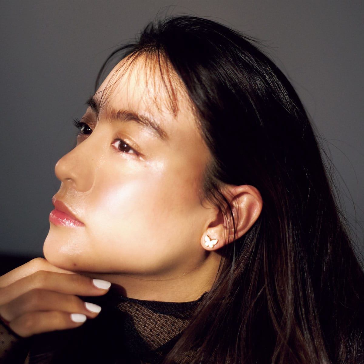 甘派の心を捉えて離さない「スウィート アルハンブラ」。新たに手に入れるなら蝶のモチーフ〝パピヨン〟を。周囲とは一線を画す選択で差をつけて。ピアス「スウィート アルハン ブラ パピヨン」〈YG×マザーオブパール〉¥332,200(ヴァン クリーフ&アーペル/ヴァン クリーフ&アーペル ル デスク)トップス¥26,400(コル ピエロ ドットコム/コル ピエロ)