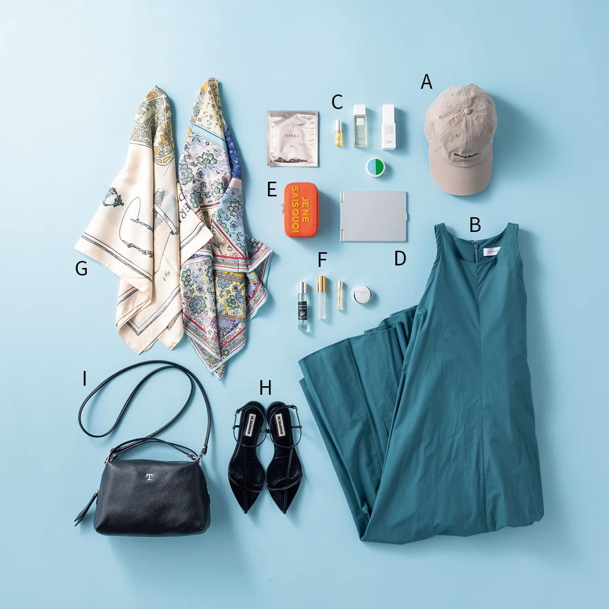 (A)キャップはコーディネートの印象に変化をつけられる万能アイテム。(B)ワンピースはあえて鮮やかな色をチョイス。バカンスにもぴったり。(C)スキンケアはあえて普段使わないものに挑戦。持ち運びに便利なミニサイズや気になっていたアイテムのトライアルセットを持参。ホテルは乾燥しやすいから保湿ケアは多めに。(D)メイクをする時、部屋によってやりづらいことがあるので鏡があると重宝します。(E)旅先でもアクセサリーを気分によって変えたいからジュエリーケースはマスト。(F)長時間フライトや旅の疲れを癒せるよう、香りのリフレッシュグッズを複数用意。(G)スカーフは嵩張らないのにコーディネートの幅を広げられるのでおすすめ。温度調節にも◎(H)足元はJIL SANDERのレザーフラットサンダルをチョイス。どんな服装にも馴染む万能アイテム。(I)旅の愛用バッグはジャンニ キアリーニのアリファ。軽くて収納力抜群。