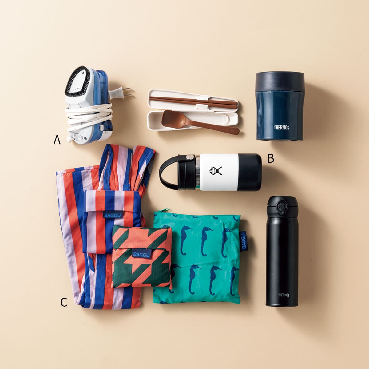 (A)トランクに入れるとどうしても洋服にシワがついてしまうので、衣類スチーマーは必須。(B)朝からビーチや船に出ずっぱりだから、THERMOSのスープコンテナとHydro Flaskの水筒を持参。フルーツやスープ、ドリンクを入れて持ち歩きます。(C)サイズ違いでBAGGUのエコバックを用意しておくとなにかと便利。濡れてもすぐ乾く素材なので海グッズを入れたり、買い物や機内手荷物用のバッグとしても大活躍。