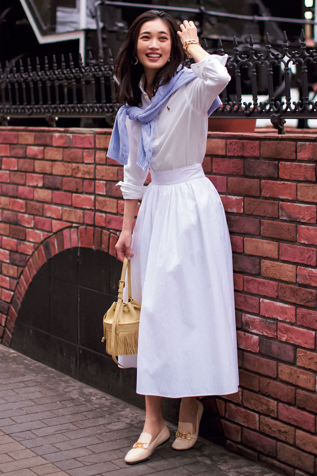 愛して止まないオールホワイトコーデは、デートのときも力を発揮。どこか甘いフレアスカートにコットンシャツとローファーを合わせることで、媚びない雰囲気に。高まる恋心もそっとカモフラージュ♡ニット¥23,100(ギャルリー・ヴィー/ギャルリー・ヴィー 丸の内店)バッグ¥148,500(J&M デヴィッドソン/J&M デヴィッドソン カスタマーセンター)ローファー¥34,100(ファビオ ルスコーニ/ファビオ ルスコーニ ルミネ有楽町店)ピアス¥45,900 ブレスレット¥37,800(ともにアビステ)