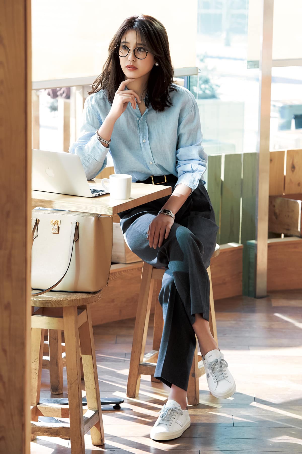 一見シンプルでも、ベルトやメガネ、旬のブランドのスニーカーなど小物ワザが光るコーデ。あれ、先輩と話してるのはスーツの営業マン風の人…?シャツ〈メンズ〉[4月発売予定]¥42,900(フランク&アイリーン/サザビーリーグ)パンツ¥20,900(ザ シンゾーン/シンゾーン ルミネ有楽町店)ベルト¥20,900(アトリエ アンボワーズ/アパルトモン 青山店)バッグ¥56,100(マイケル マイケル・コース/マイケル・コース カスタマーサービス)スニーカー¥33,000(デイト/ティースクエア プレスルーム)メガネ¥39,600(アイヴァン/アイヴァン 東京ギャラリー)イヤリング¥5,940ブレスレット¥5,400(ともにアビステ)ネックレス¥19,800(イン ムード/フォーティーン ショールーム)時計¥14,850(クルース/HIROB ルミネ新宿店)
