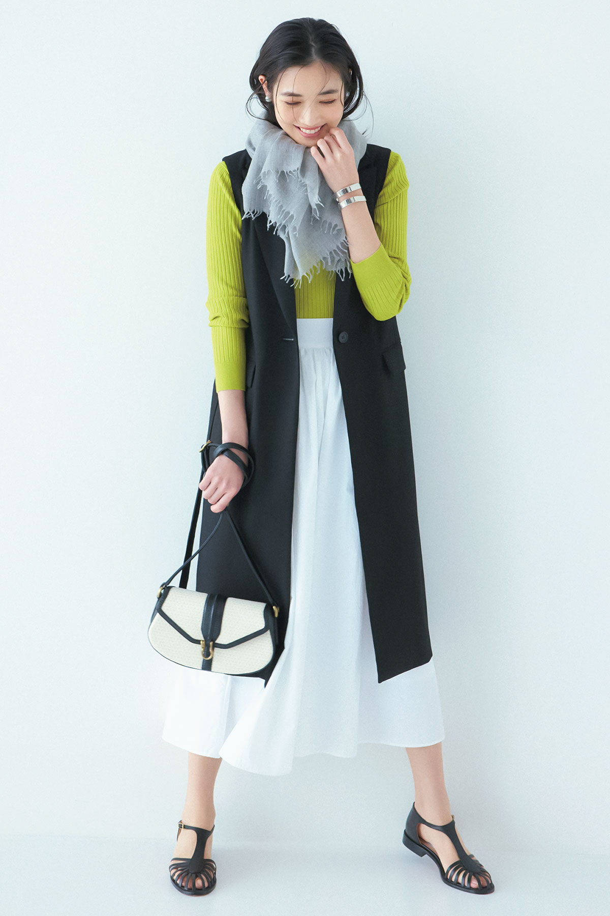 ベーシックなアイテム同士の着こなしを無理なくアップデートさせる、パキッとしたイエローのニット。モノトーン配色の中に投入することで、コーディネート全体が爽快に、春らしく。〝張り切っていないのにオシャレ〟という印象をさらりと叶えてくれます。ニット¥19,800(アルアバイル)バッグ¥37,400(トフ&ロードストーン/T&L)サンダル¥68,200(ネブローニ/アッシュプラス エリオトロープ)ストール¥48,400(ベグ アンド コー/ボーダレス)ピアス¥5,400 バングル¥4,400(ともにアビステ)