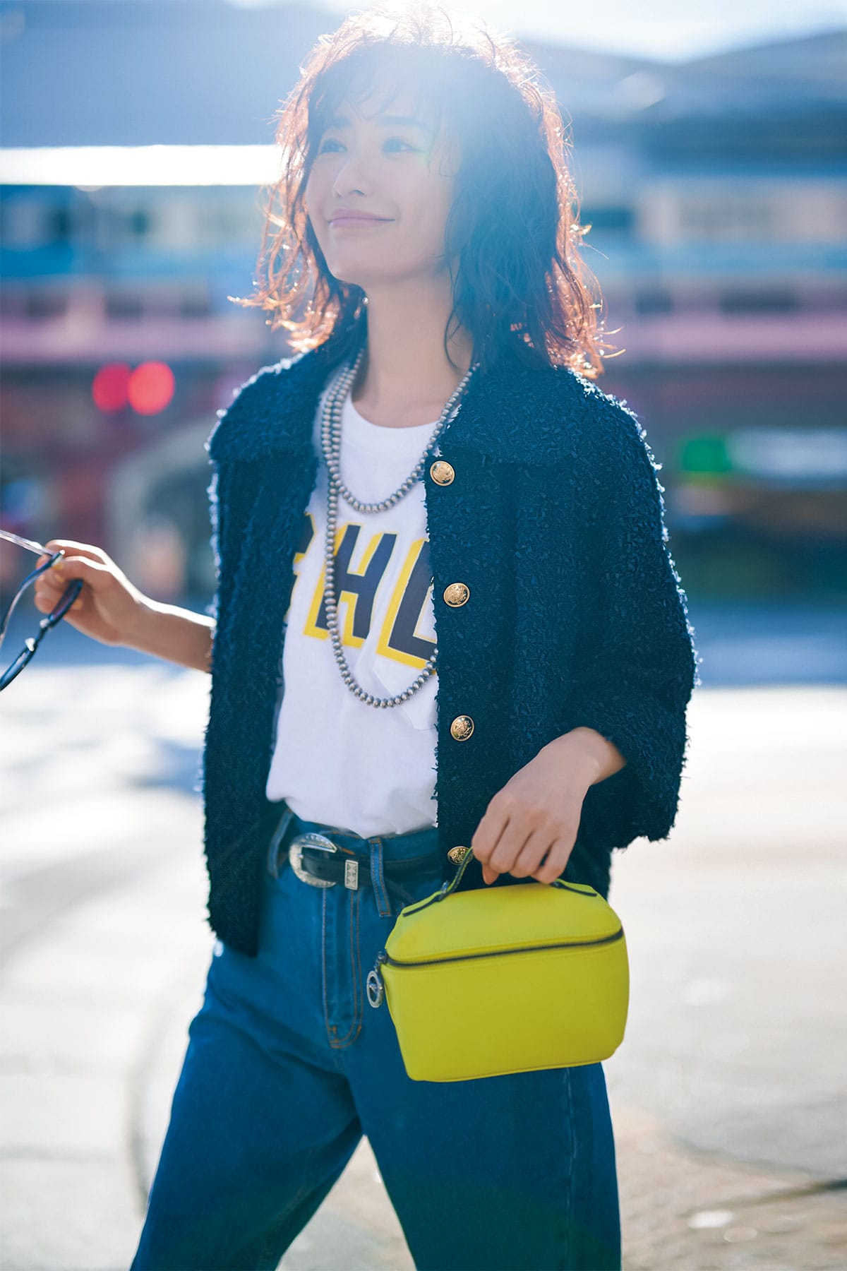 カジュアルコーデにカーデ感覚で羽織るだけで、旬なムードに仕上げてくれるツイードジャケットは今季のマストハブアイテム。ジャケット¥82,500(ユナイテッドアローズ/ユナイテッドアローズ 六本木ヒルズ店)Tシャツ¥7,700(オリジナル チャコール/チャコール トーキョー)パンツ¥29,700(オネスト/LE PHIL NEWoMan 新宿店)ベルト¥29,700(アルベルト ルティ/アマン)サングラス¥44,000(アイヴァン/アイヴァン 東京ギャラリー)ネックレス¥275,000〈タナーズ インディアン アーツ〉イヤリング¥42,900〈ハルポ〉(ともにロンハーマン)バッグ¥46,200(ロンシャン/ロンシャン・ジャパン)