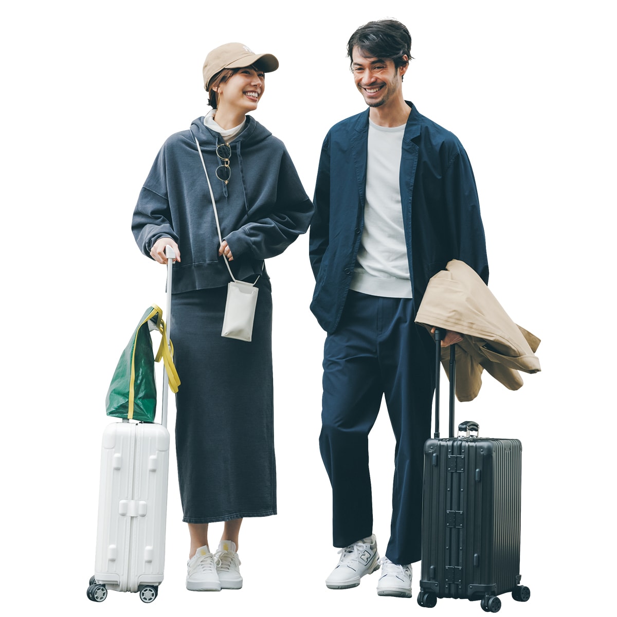 フーディ¥20,680スカート¥16,280(ともにレミレリーフ×カオス/カオス丸の内)中に着たカットソー¥10,780(ルーニィ)キャップ¥4,400(ニューエラ)スマホバッグ¥9,900(カーサ ガリャルダガランテ/ガリャルダガランテ 青山)トートバッグ¥14,300(アンドミューク/アマン)スーツケース¥111,100(リモワ/リモワ クライアントサービス)スニーカー¥12,980(ニューバランス/ニューバランスジャパンお客様相談室)サングラス¥47,300(アイヴァン/アイヴァン 東京ギャラリー)ピアス¥10,560(チビジュエルズ/チビジュエルズ・ジャパン)[男性]ジャケット¥35,200(スティル バイ ハンド/スタイルデパートメント)、コート¥77,000、パンツ¥31,900(ともにナナミカ/ナナミカ 代官山)、ニット¥33,000(ジョンスメドレー/リーミルズエージェンシー)、シューズ¥17,600(ニューバランス/ニューバランスジャパンお客様相談室)スーツケース¥193,600(リモワ/リモワ クライアントサービス)