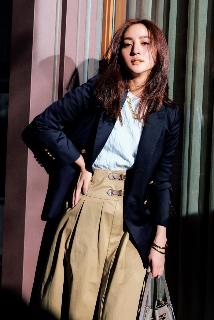 CLASSY.ベーシックの核となるネイビーブレザーが主役の好感度トラッド。ドレッシーになりすぎないボクシーなフォルムと、ロロ・ピアーナ社製の上質ウールが生み出す絶妙なコンビネーションで、大事な会議の日にはもちろん、カジュアルを格上げしたい日にも大活躍。ジャケット ¥81,400 ニット ¥17,600 スカート ¥31,900 バッグ ¥61,600 ネックレス ¥24,200 バングル ¥19,800(すべてブルックス ブラザーズ/ブルックス ブラザーズ ジャパン)